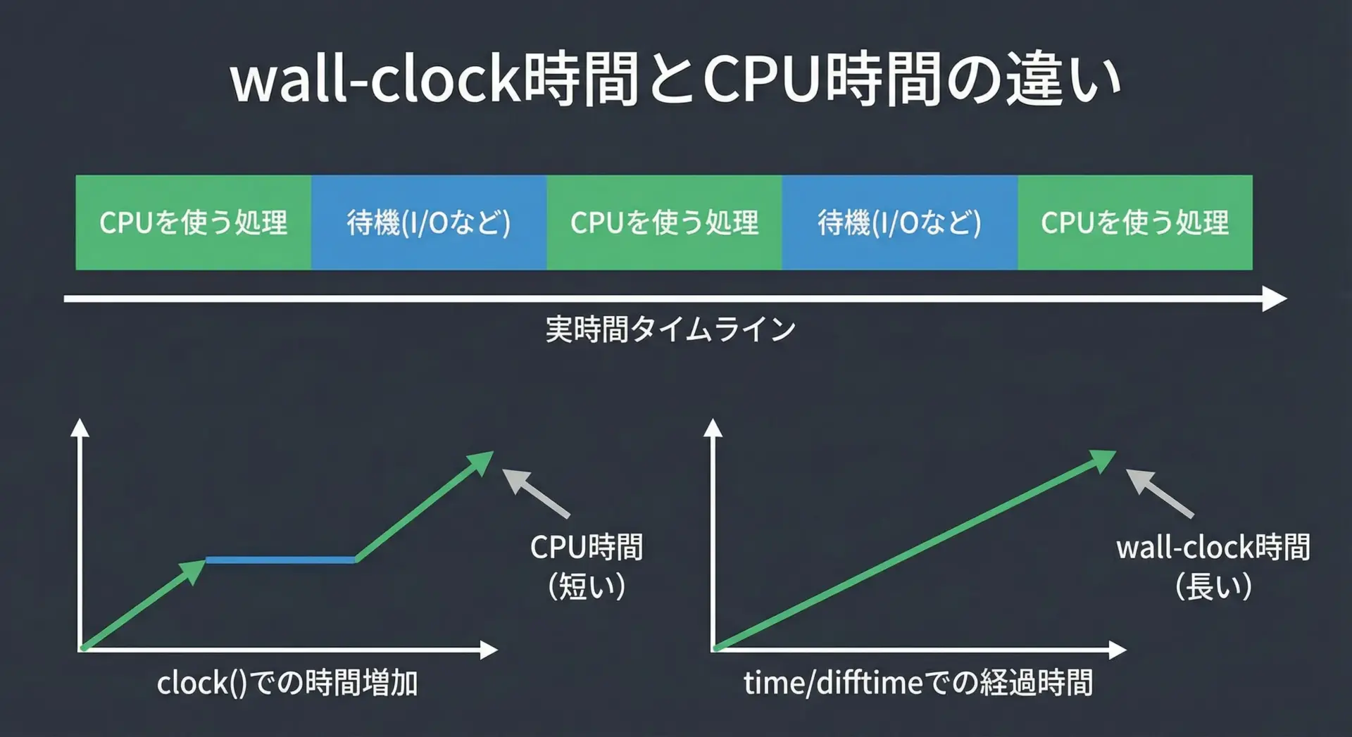 I/O待ちが長いプログラムでは、clockの値はあまり増えませんが、difftimeでの経過時間は大きくなります。