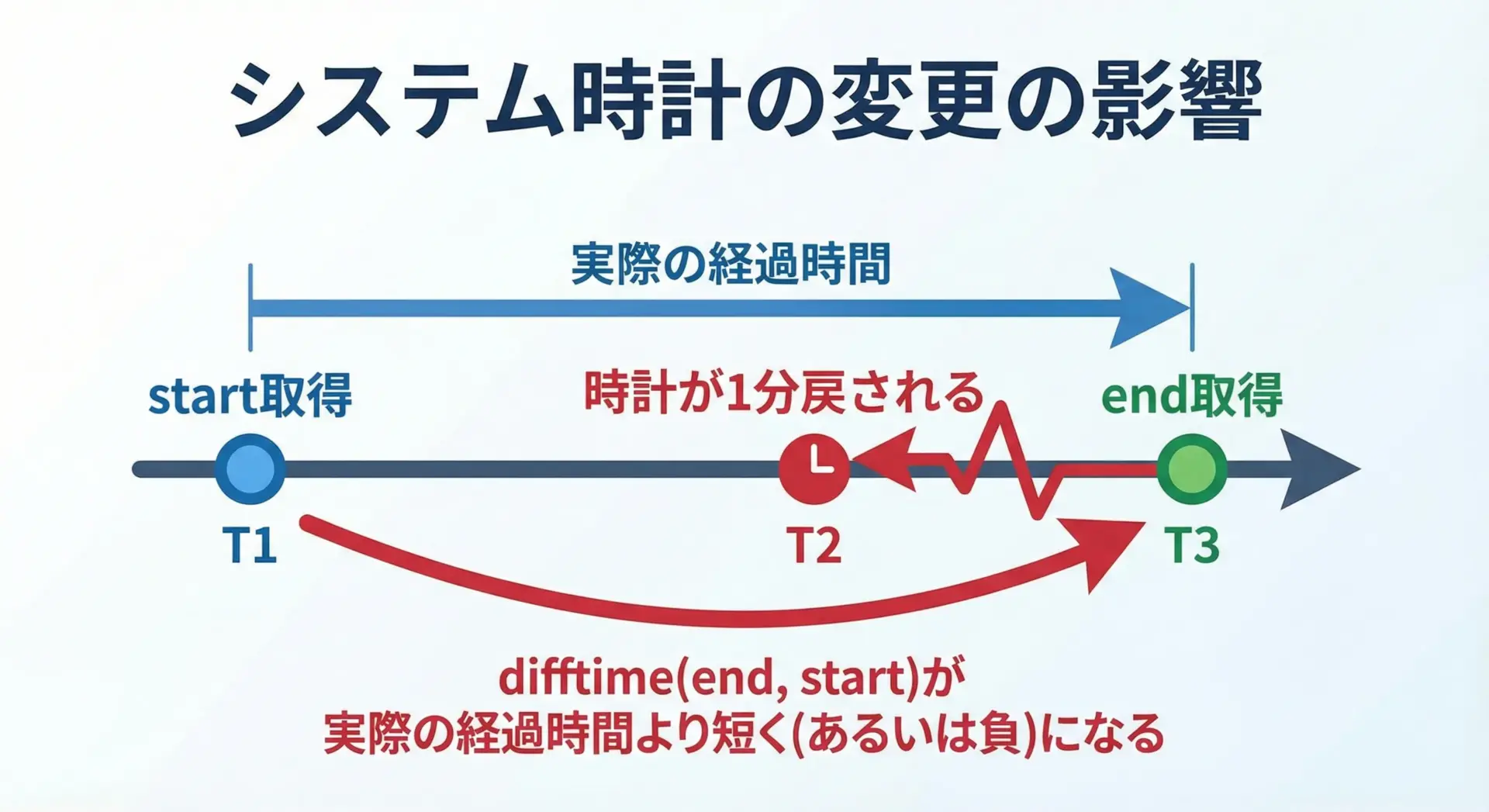 time_tの環境依存や時計変更の影響、clock関数との違いを理解したうえで、用途ごとに適切なAPIを選ぶことが重要です。