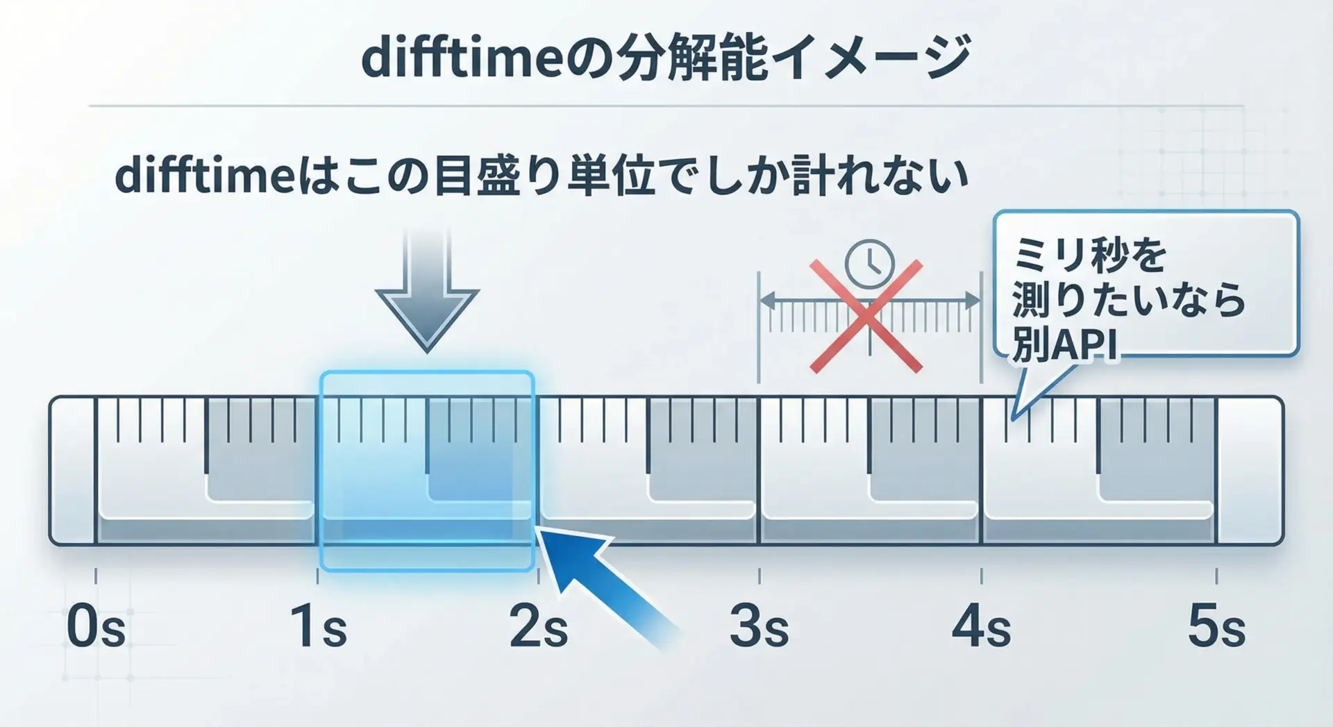 秒単位の粗い計測にはdifftimeを、それ以上の精度が必要な場合には高精度タイマーへと橋渡ししていく設計を心がけてください。
