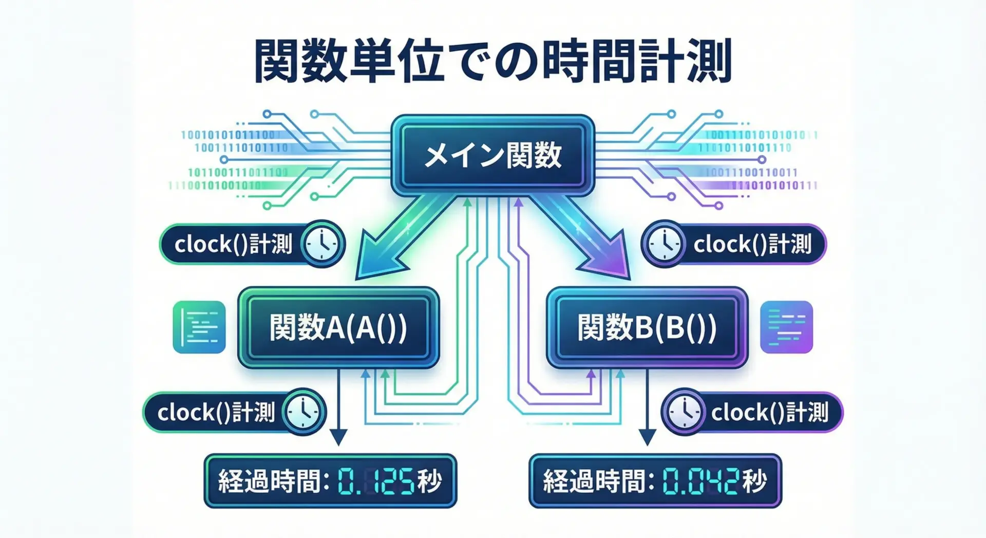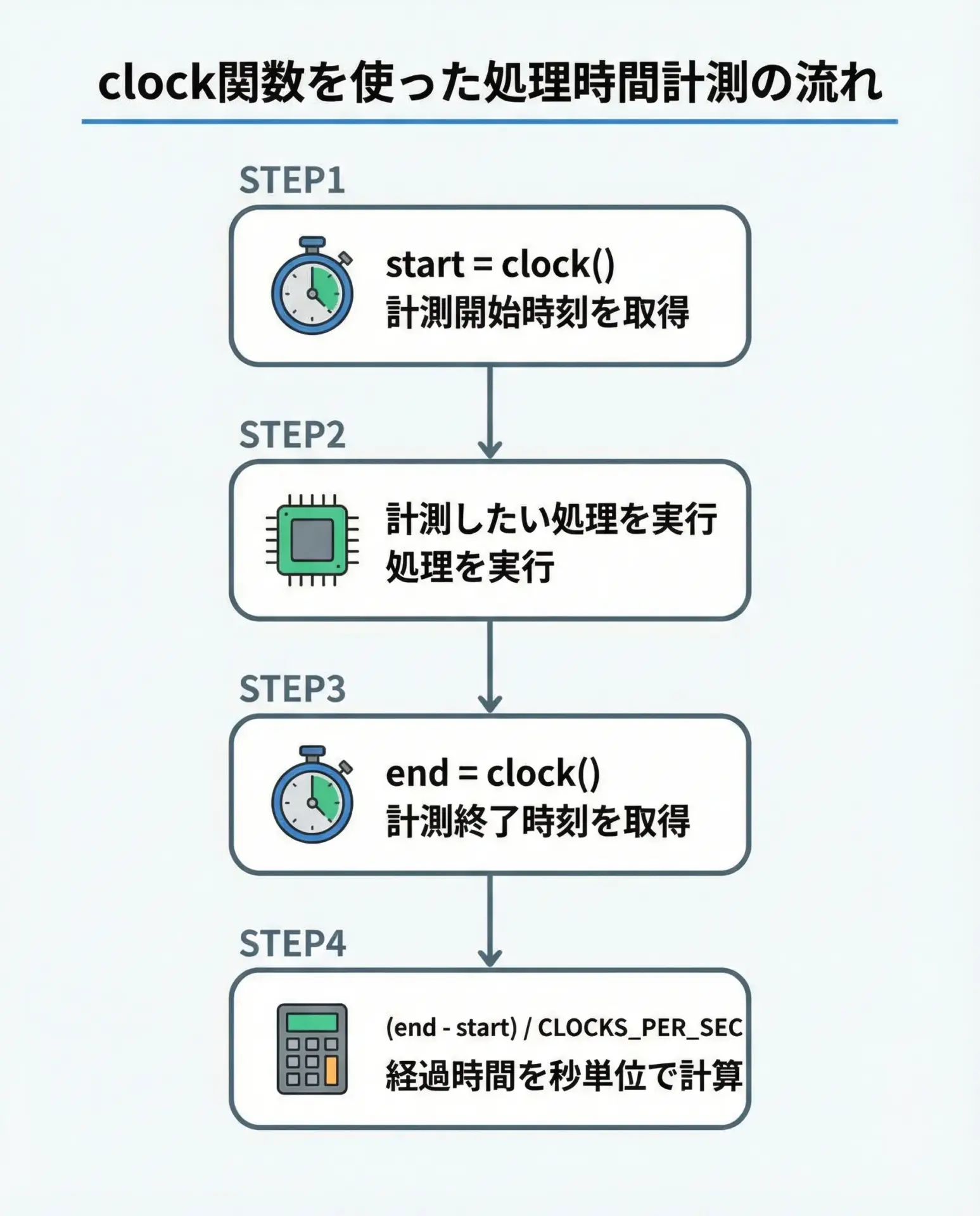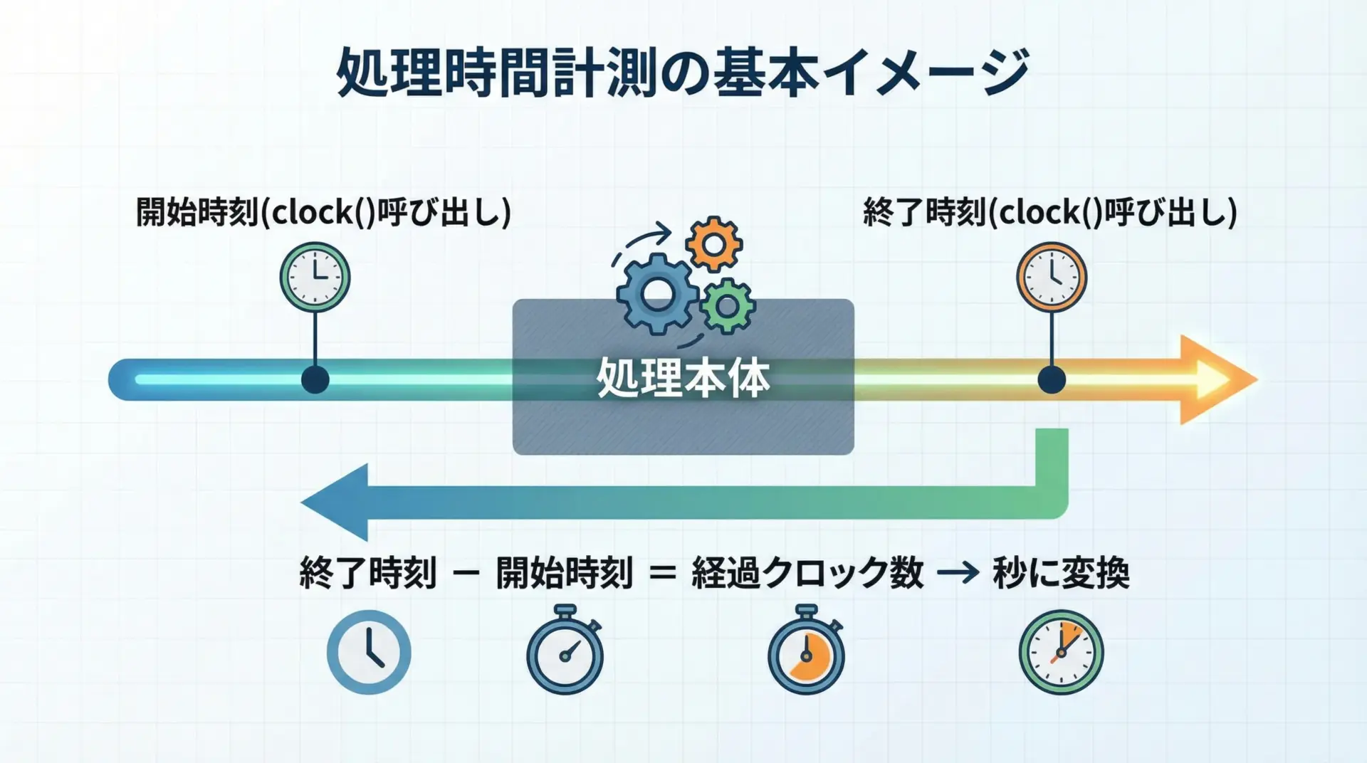 開始時刻と終了時刻をclock()で取得し、その差をCLOCKS_PER_SECで割るという基本さえ押さえれば、ループや関数の処理時間を簡単に測ることができます。