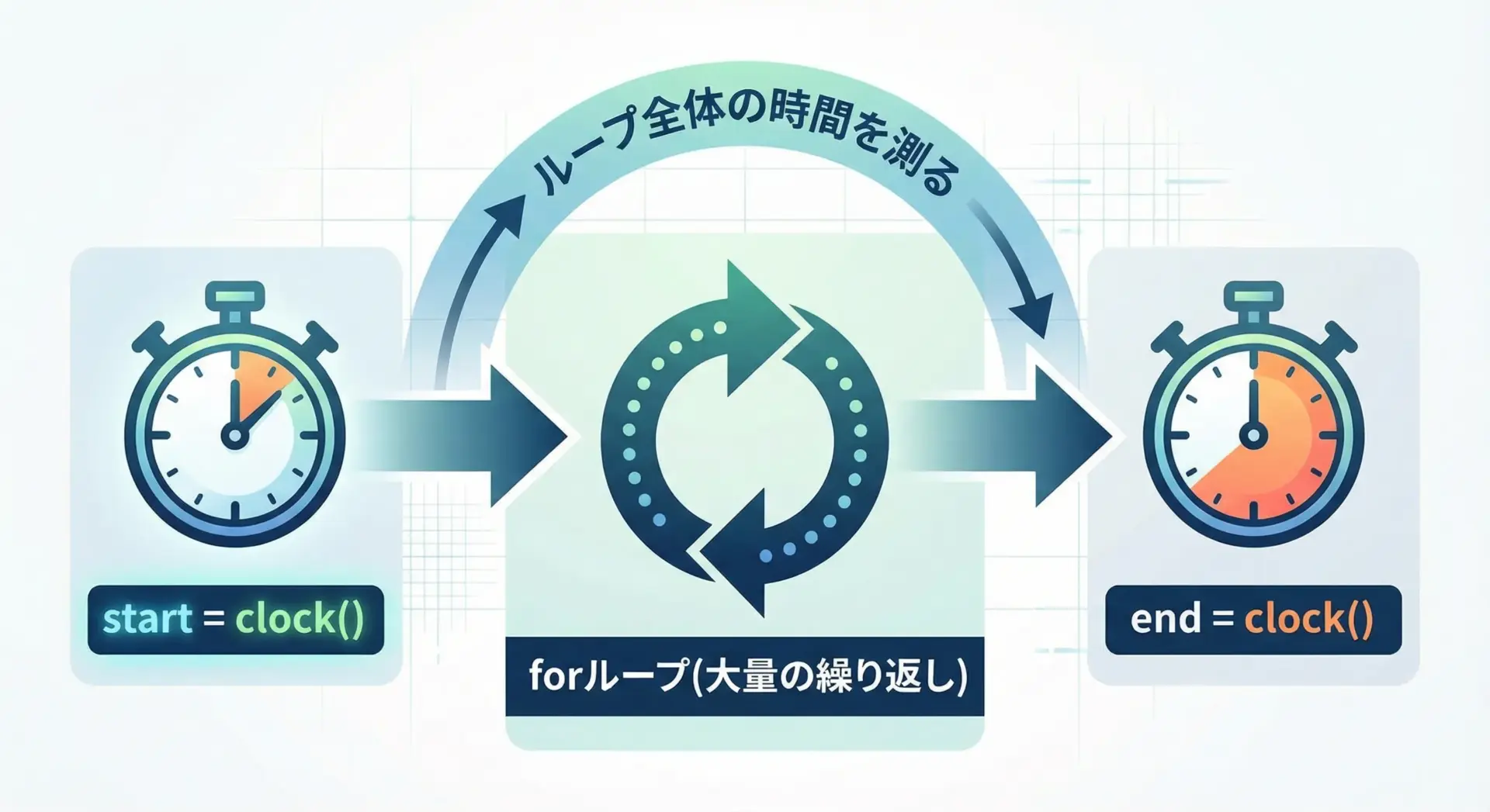 このように、ループの前後でclockを呼び、差分を求めるだけで、ループ全体の処理時間を簡単に測定できます。