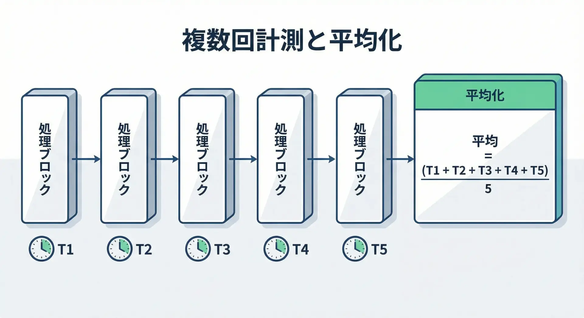そこで、同じ処理を複数回計測し、その平均値を取ると、より安定した目安を得られます。
