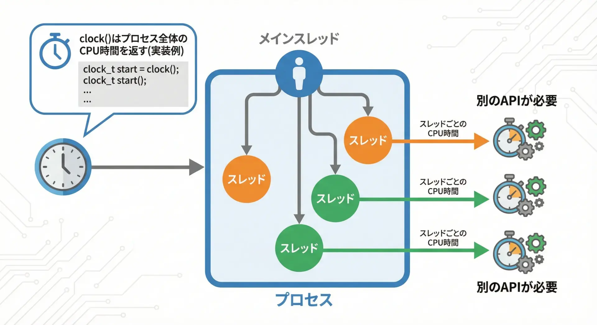 マルチスレッド環境では、clock関数を使うときに追加の注意が必要になります。