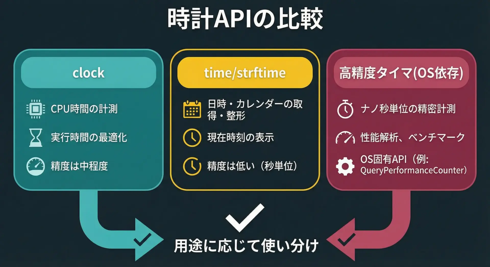 このように比較すると、clock関数は「標準Cだけで、CPU時間のおおまかな目安を知りたいとき」の選択肢だと位置付けられます。