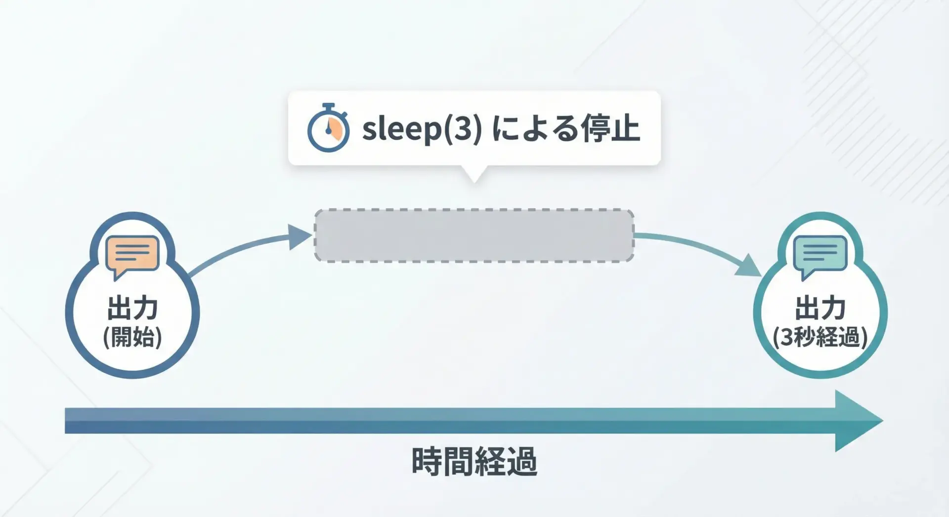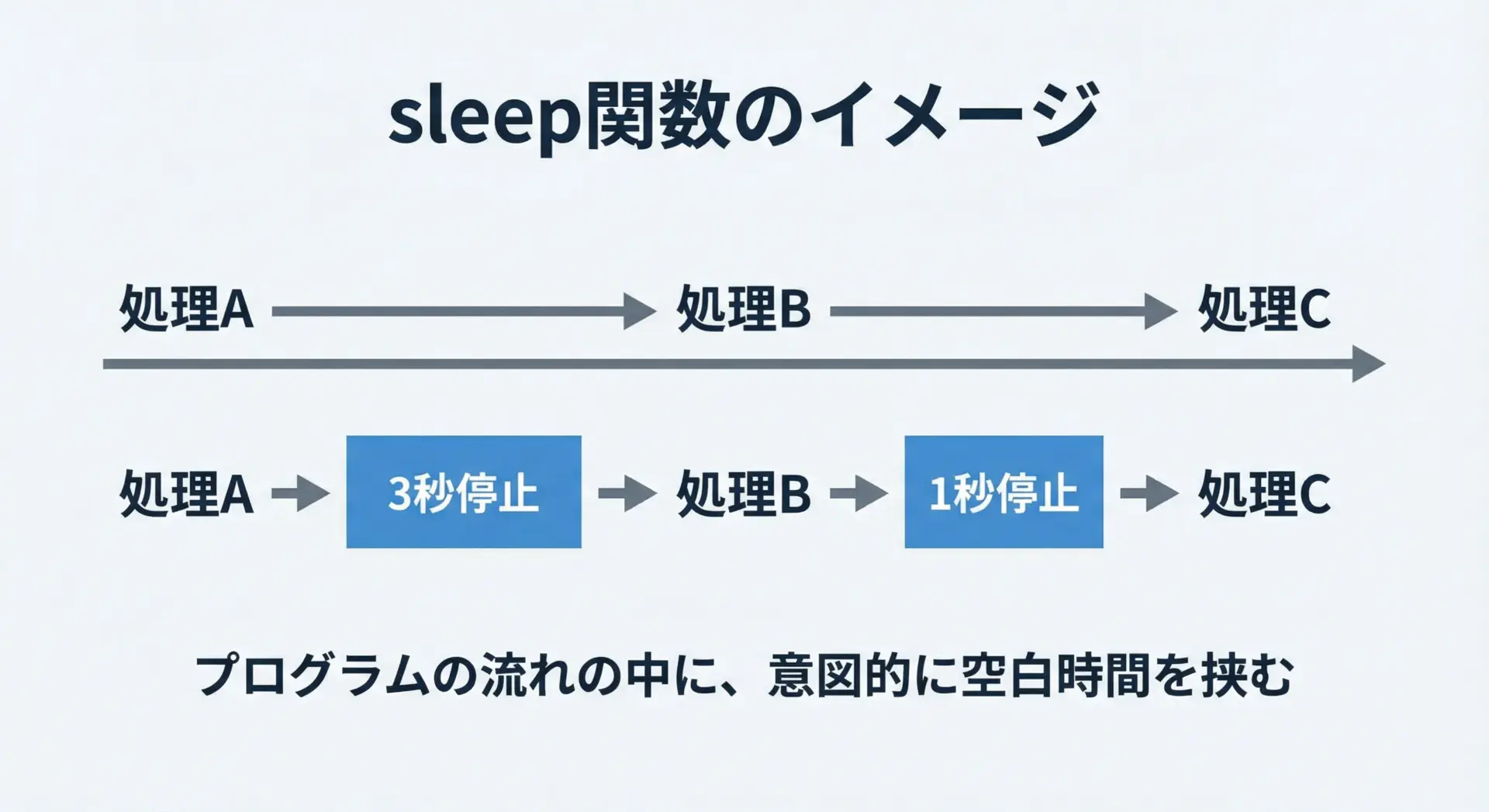 このようにsleepは「何もしない時間」を明示的に作るための基本機能です。