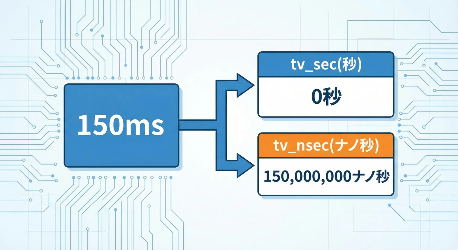 req.tv_nsec = (msec % 1000) * 1000000L; // ミリ秒 → ナノ秒