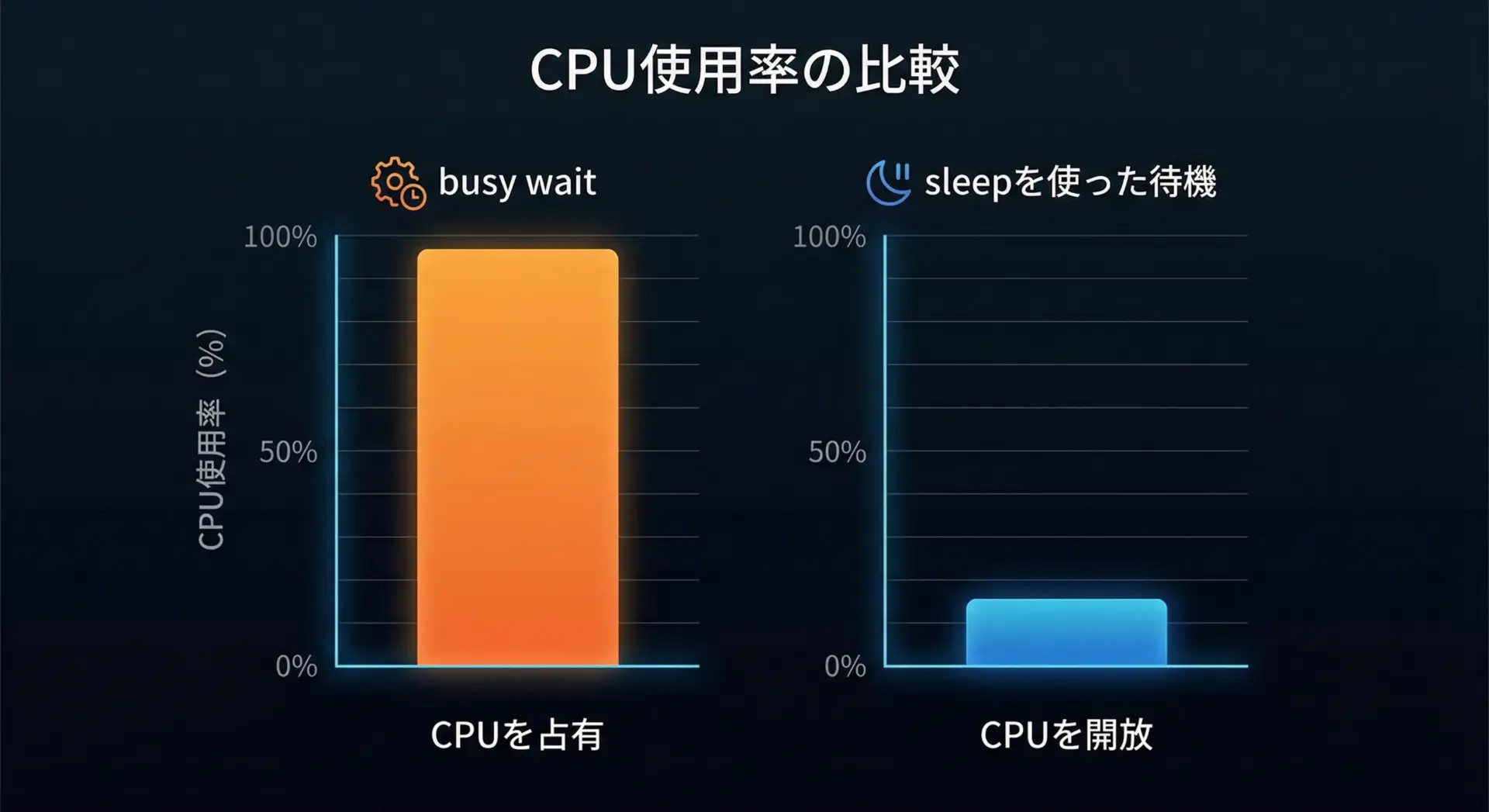 sleepを使えば、OSがスレッドを休ませてくれるため、他のプロセスにCPUを譲ることができます。