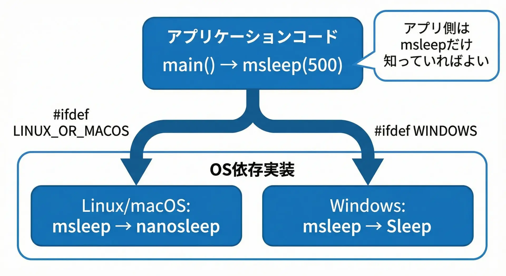 このように共通インターフェース(msleep)を定義し、内部でOSごとのAPIを呼び分けることで、アプリケーションコードの可読性と移植性が大きく向上します。