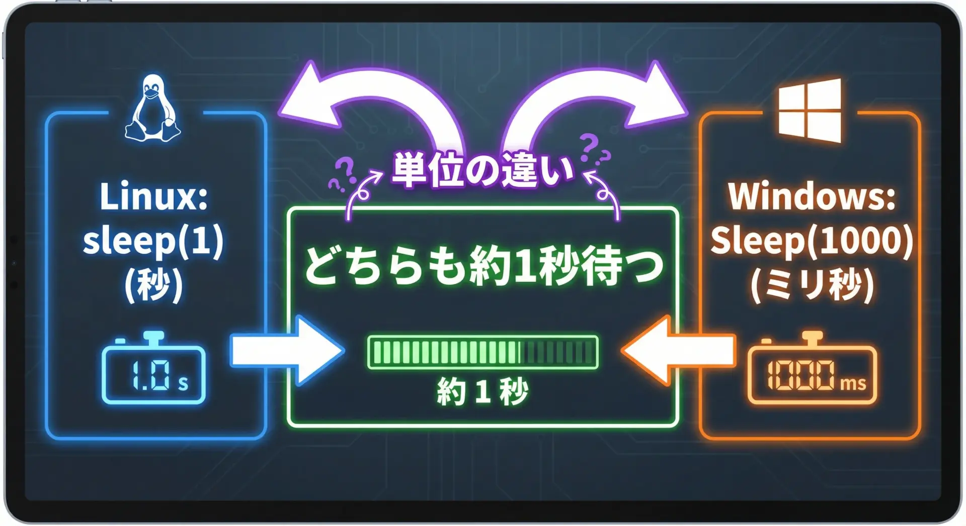秒・ミリ秒・Windows対応を押さえて、実用的で移植性の高い時間待機処理を設計してください。