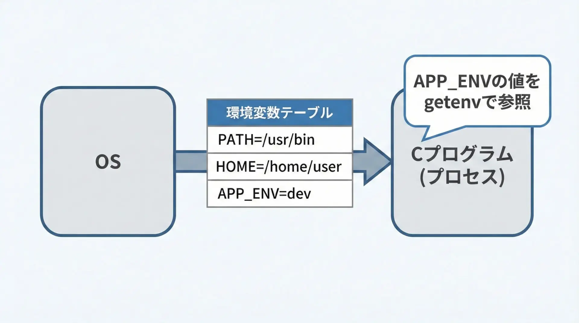環境変数は、シェルやOSから設定され、プロセス生成時にまとめて渡されます。