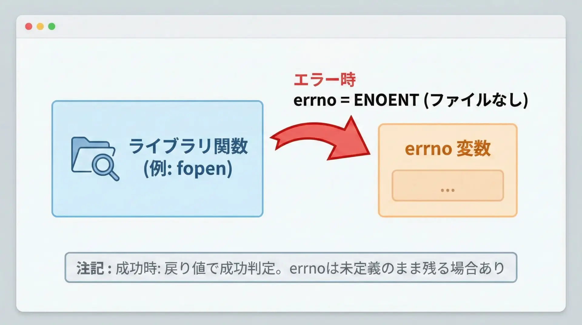 このようにerrnoは、戻り値だけでは分からない「なぜ失敗したか」を教えてくれる補助情報として機能します。
