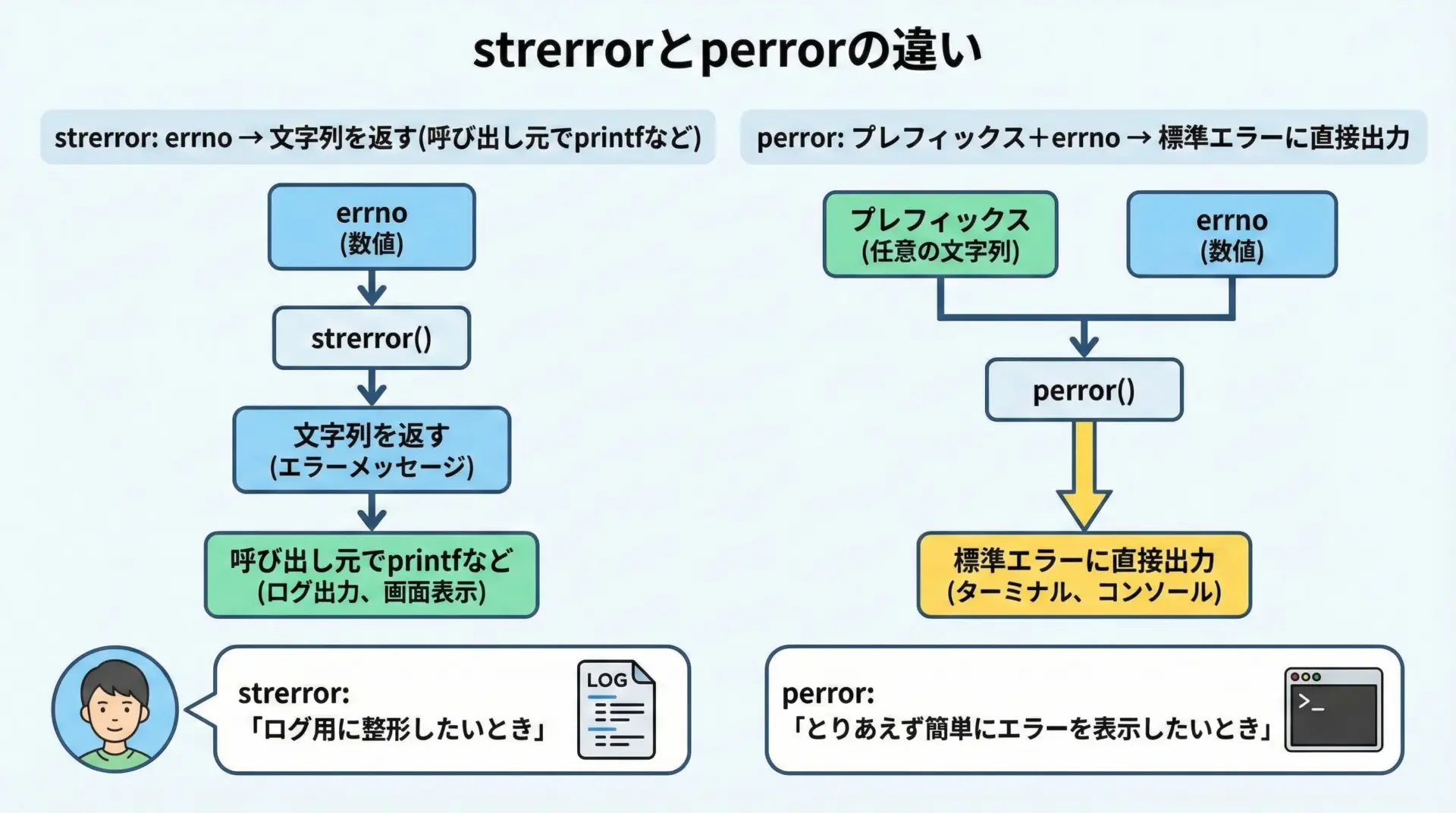 strerrorはメッセージを「取得する」関数、perrorはメッセージを「表示する」関数と覚えると整理しやすいです。