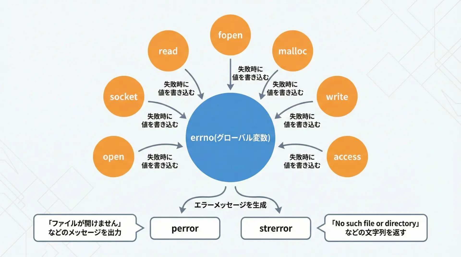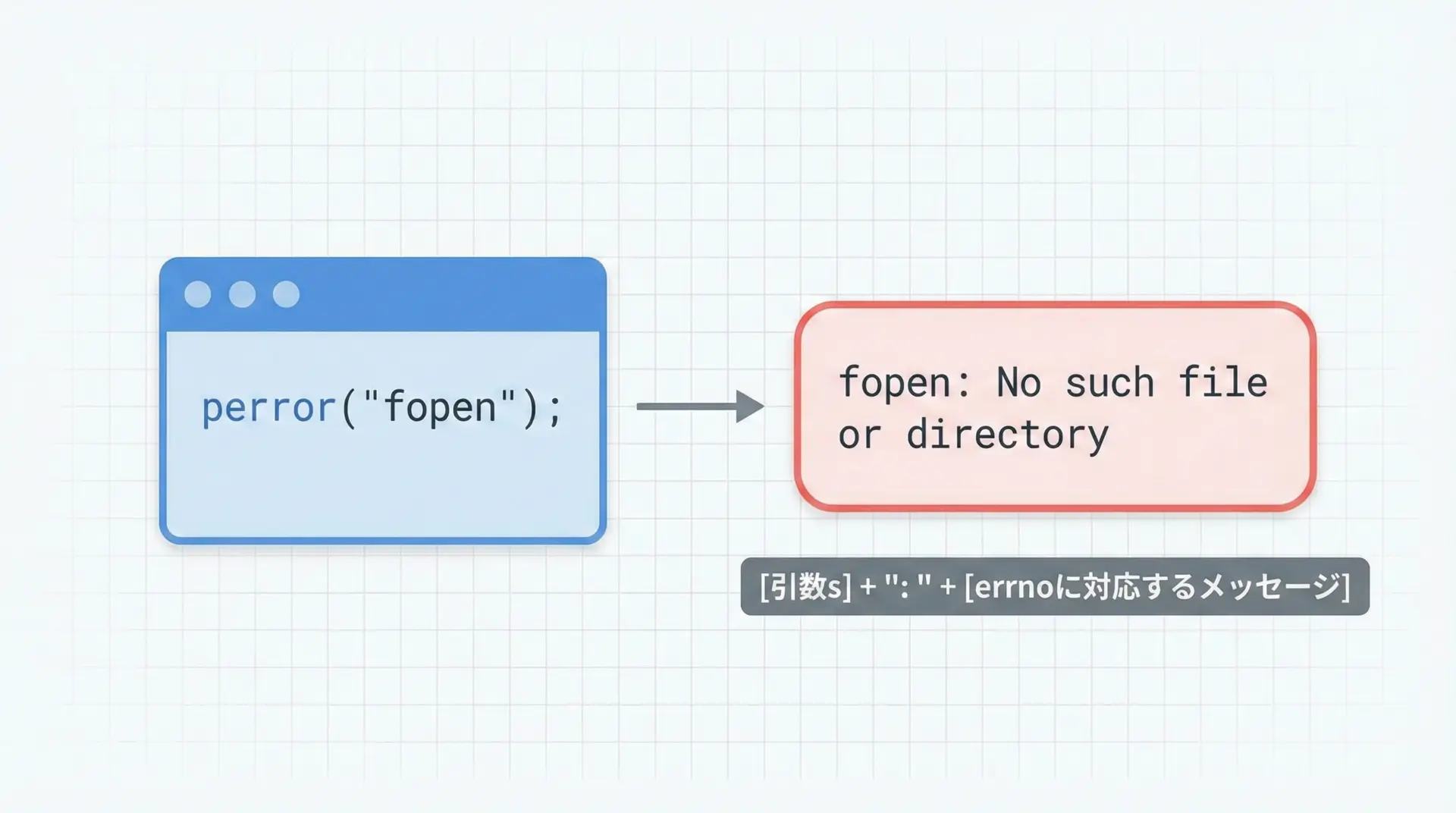 perror関数は、errnoに格納されたエラー情報を、人間が読める形で標準エラー出力に表示するためのシンプルかつ強力な関数です。