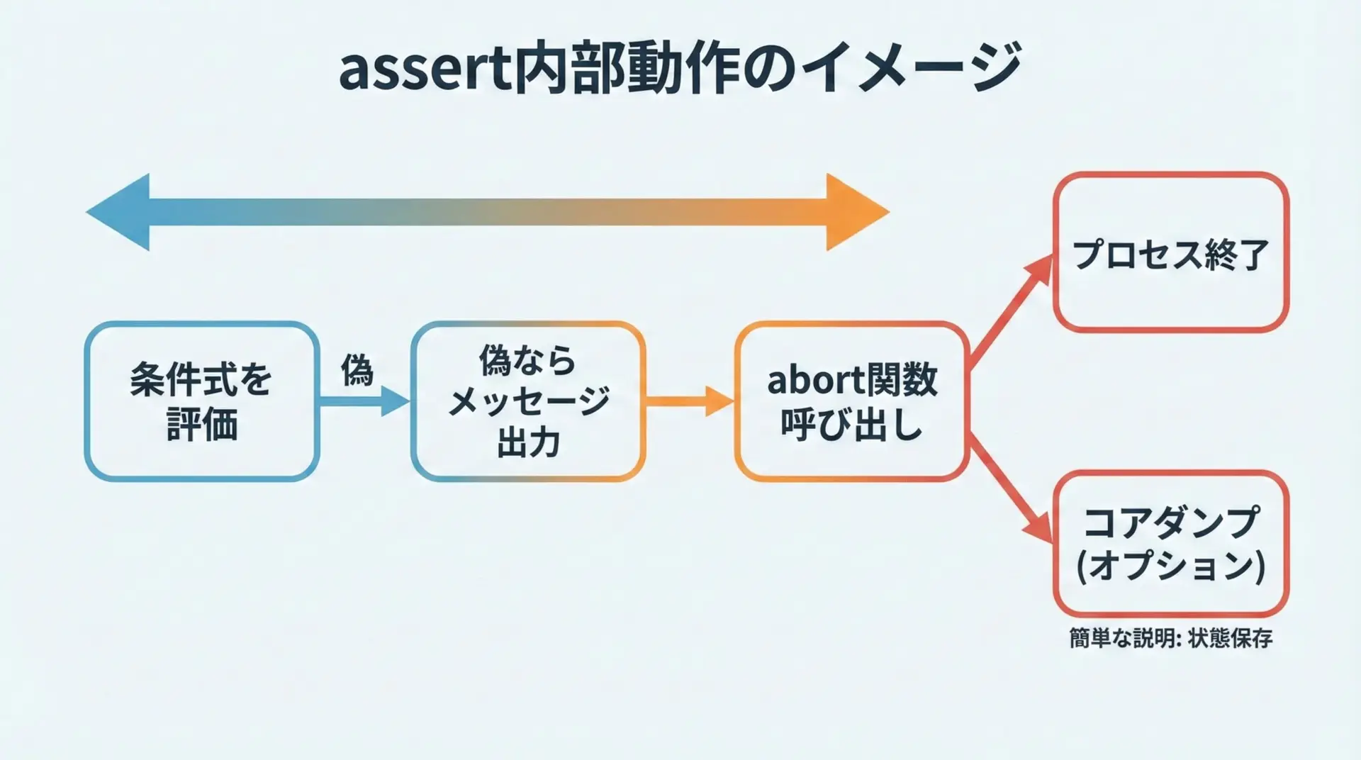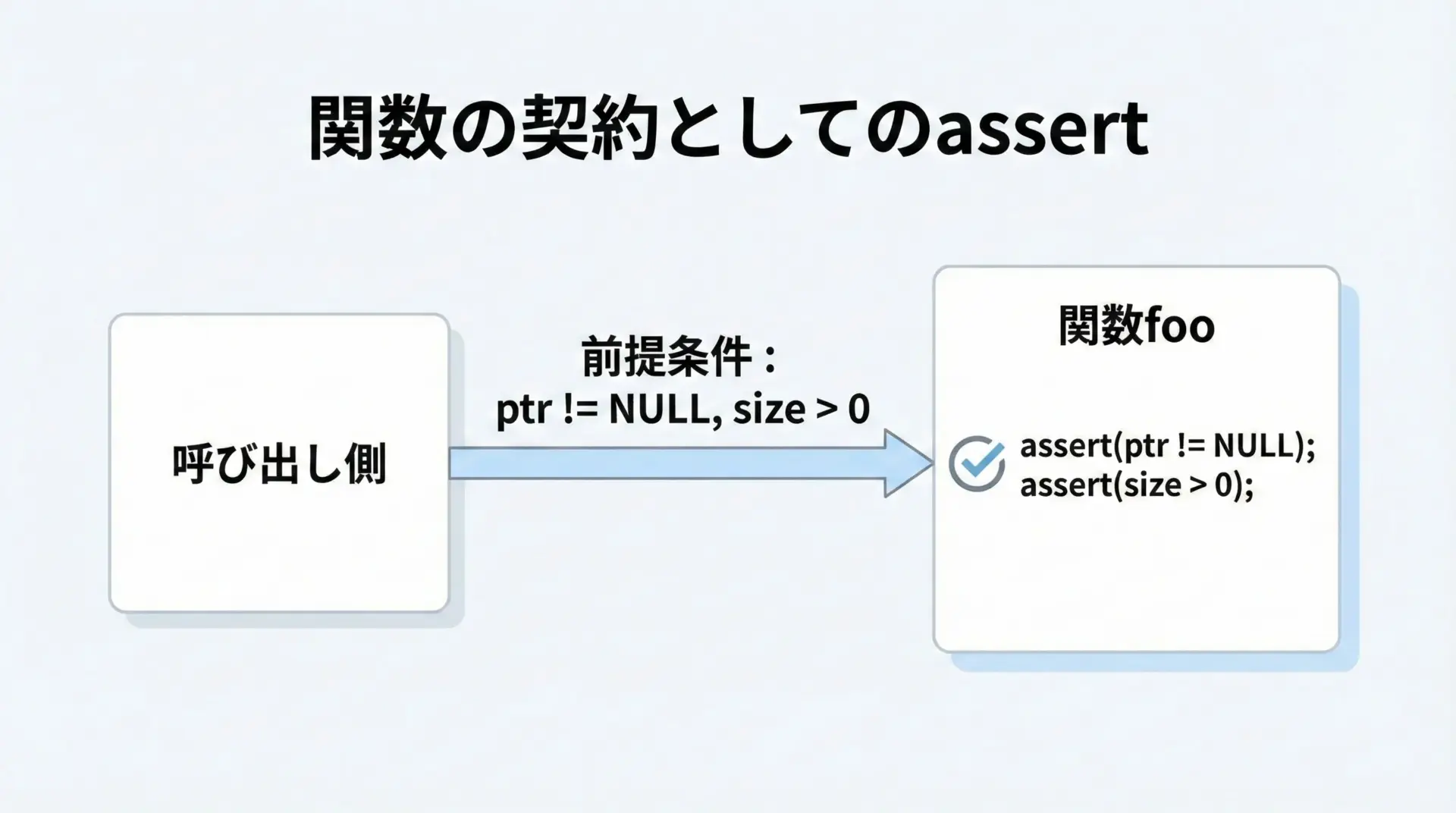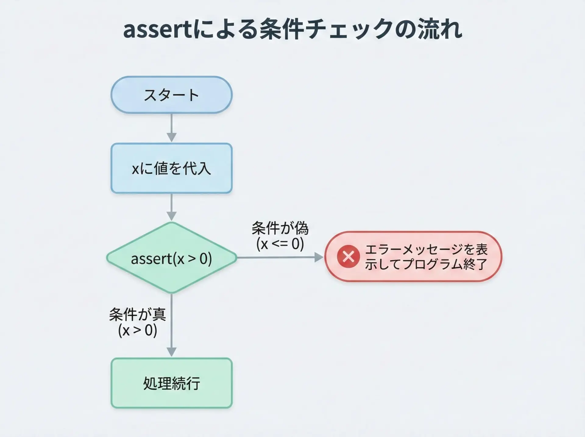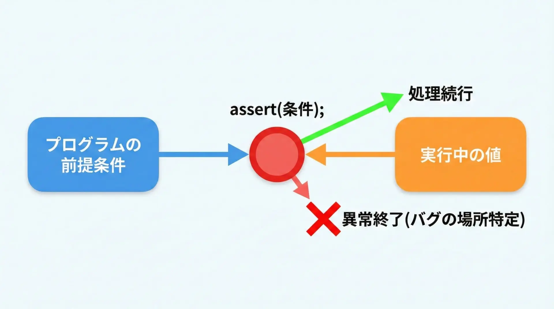 バグを「隠す」のではなく、「早めに爆発させて場所を特定する」道具がassertだと考えると理解しやすいです。