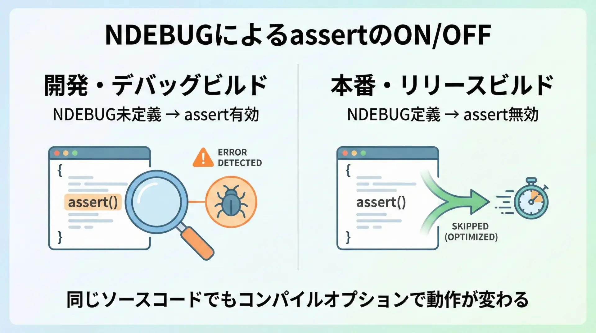 このようにビルドオプションを切り替えることで、デバッグ時にはassertを有効に、本番用バイナリでは無効にするといった運用が可能です。