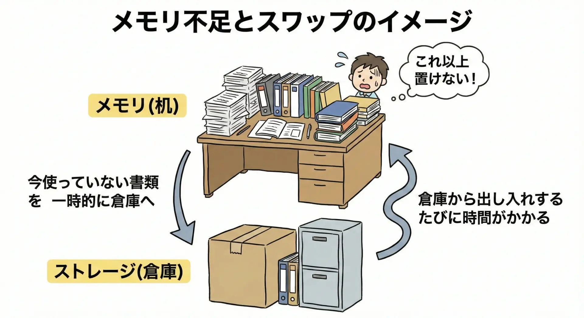 これは、メモリを「見かけ上」増やすための仕組みですが、ストレージはメモリより非常に遅いため、次のような現象が起こります。