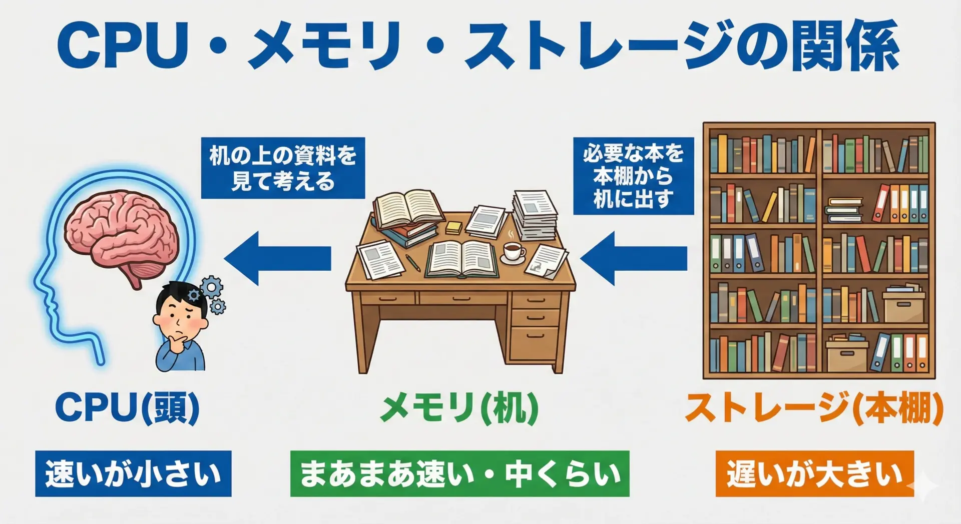 3者の関係は「頭(CPU)」「机(メモリ)」「本棚(ストレージ)」のアナロジーで理解すると整理しやすくなります。