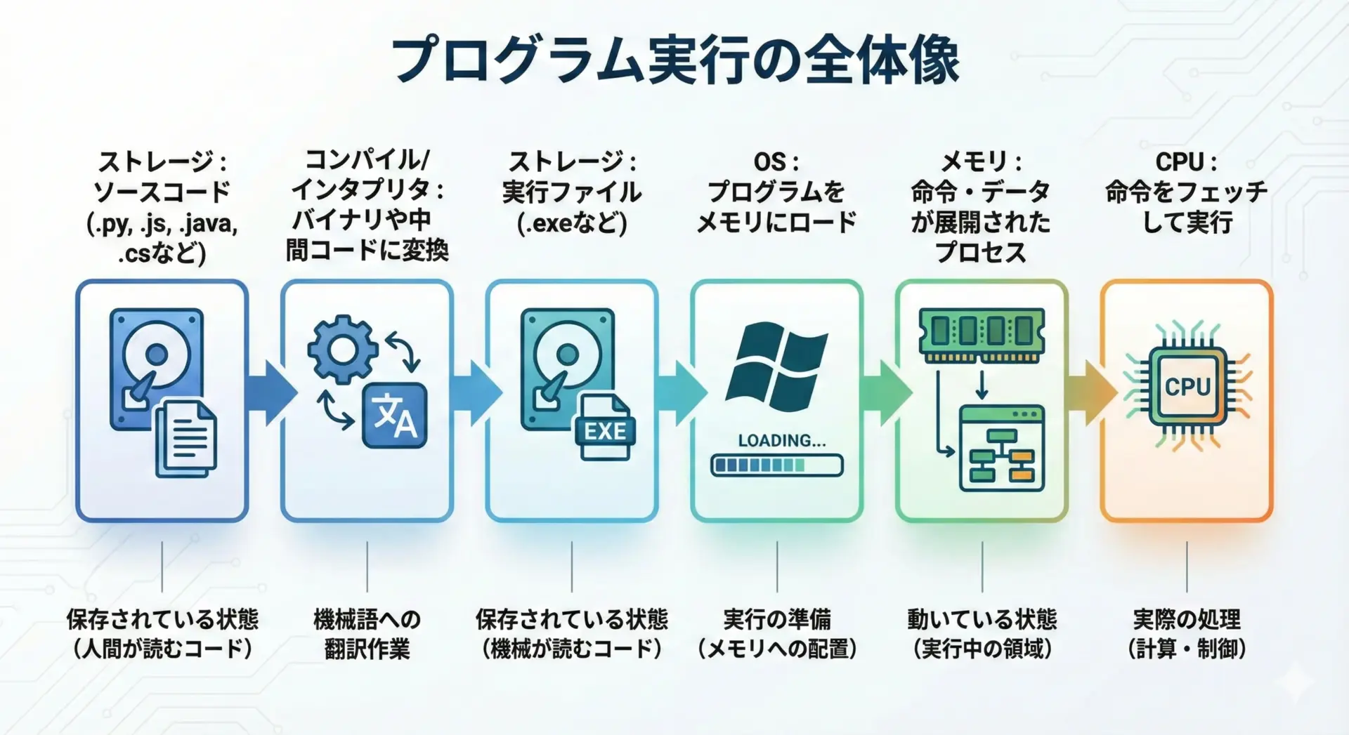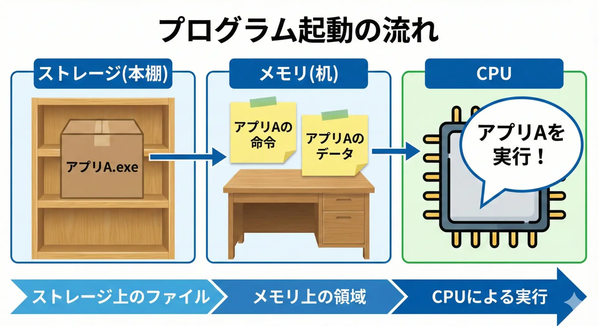 プログラムが「起動する」とは、ストレージ上のファイルがメモリに読み込まれ、CPUがそこにある命令の実行を開始することだと考えられます。