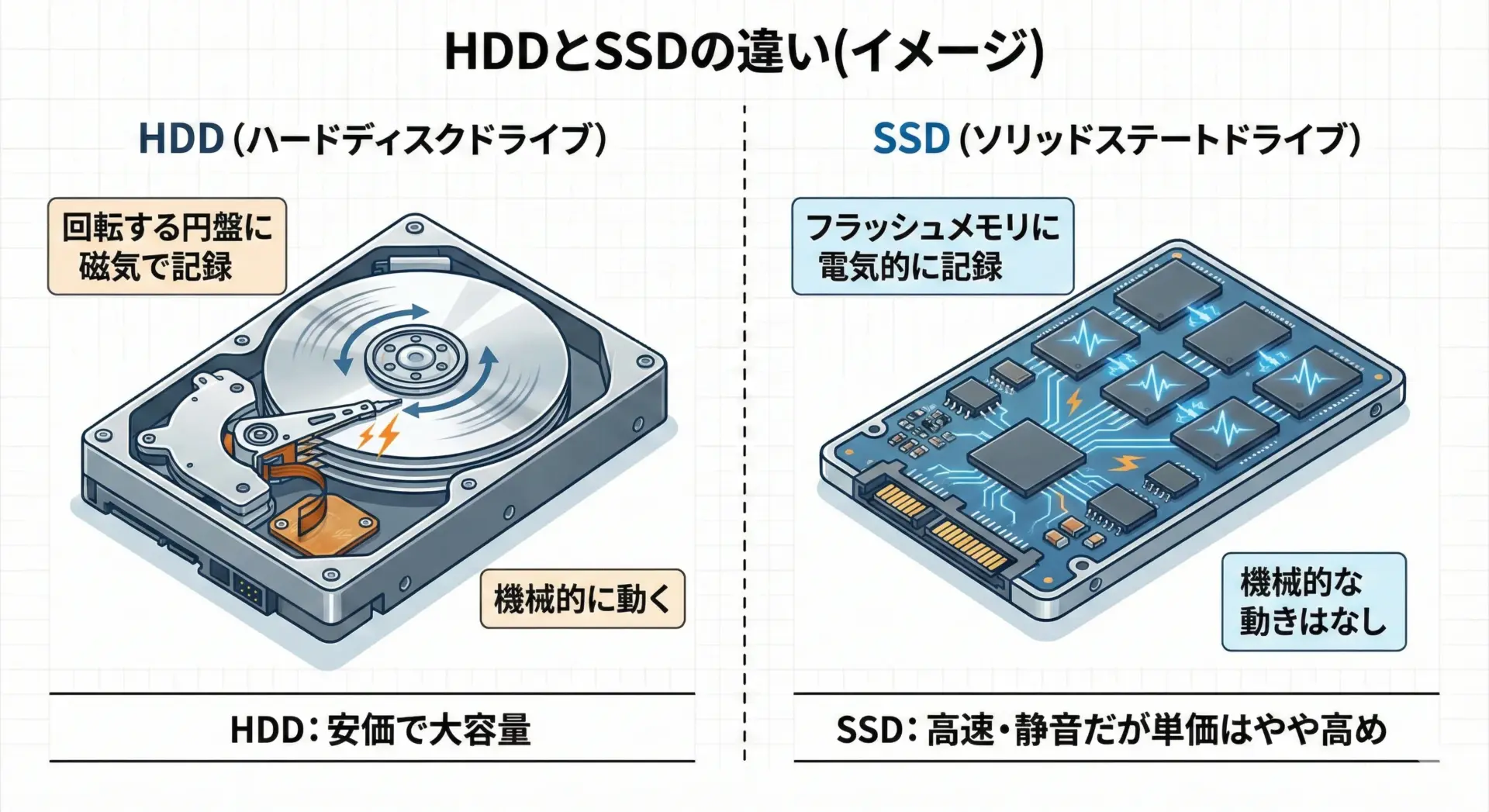 - SSD: フラッシュメモリを使うため、読み書きが高速で、振動にも強く静かだが、容量あたりの価格は高め