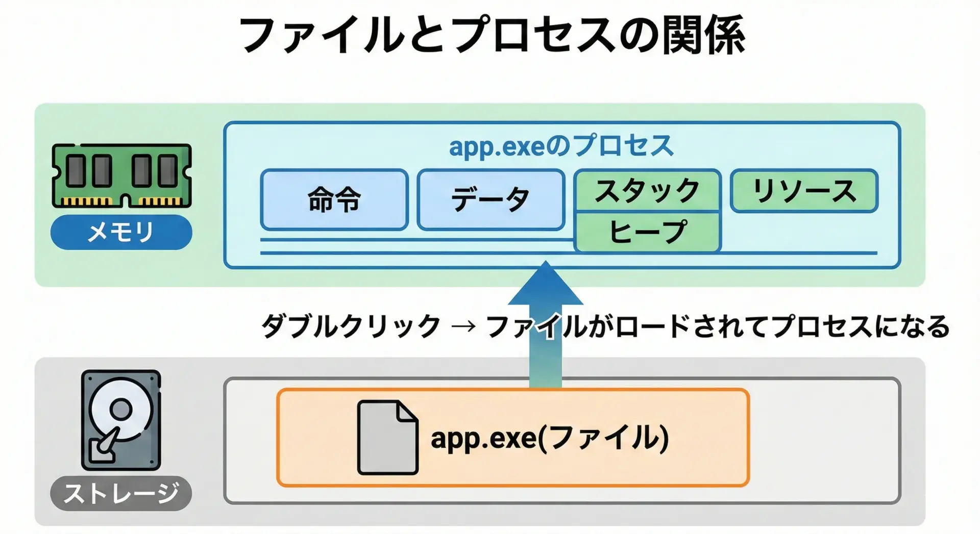- ストレージ上の「ファイル」が、メモリ上にロードされることで「プロセス(動いているプログラム)」になる