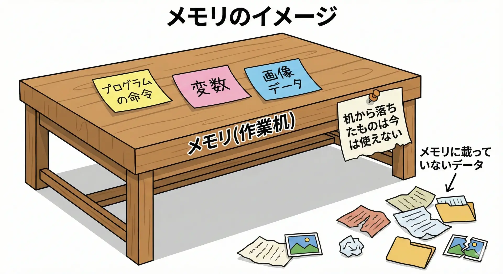 - メモリはCPUが今すぐ使う命令やデータを置く「作業机」であり、容量不足は実行速度や安定性に直結する