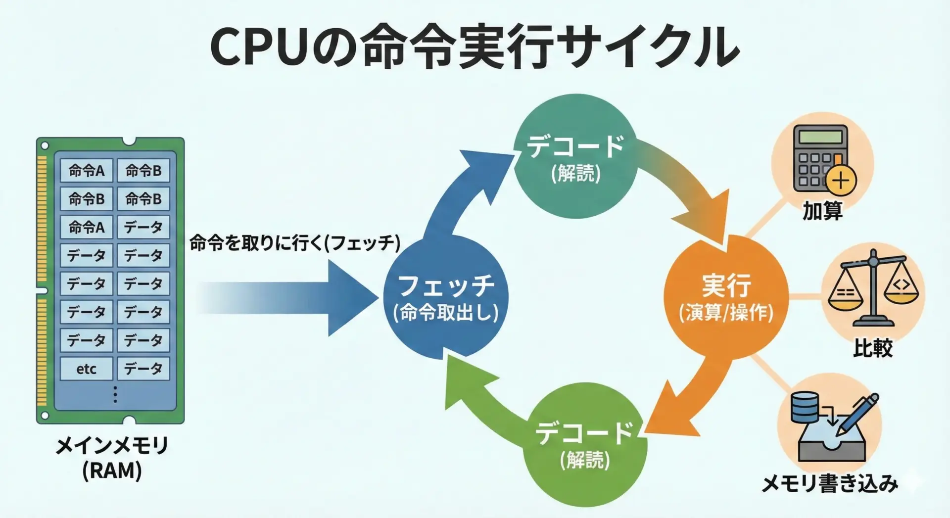 このサイクルが、1秒間に数十億回というレベルでひたすら繰り返され、あなたのプログラムの処理が進んでいきます。