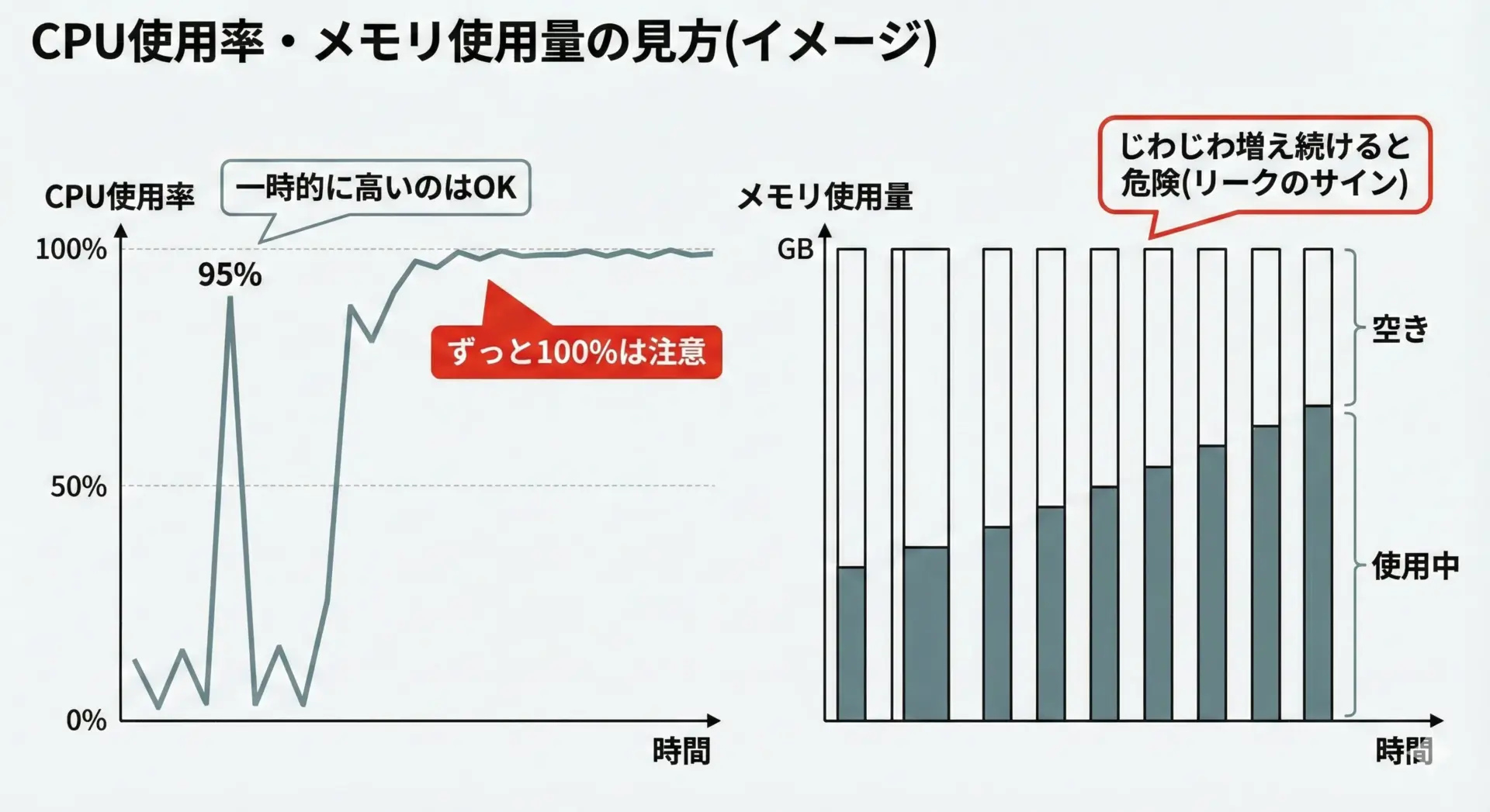 プログラミング学習の段階から、自分の書いたプログラムを実行しながらCPU・メモリの状況を眺める習慣をつけておくと、あとで性能問題に向き合うときの基礎感覚が養われます。