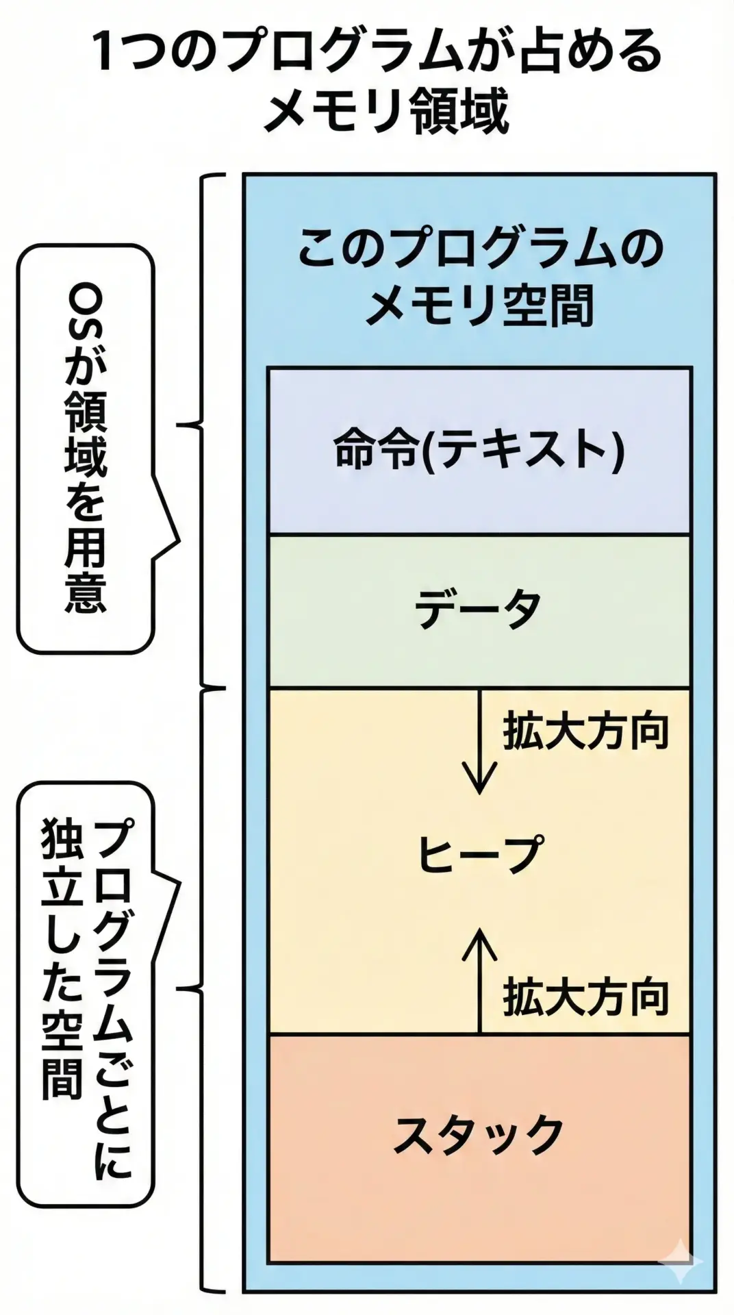 - コードが動く場所: 実行時にOSが確保するメモリ空間と、それを処理するCPU