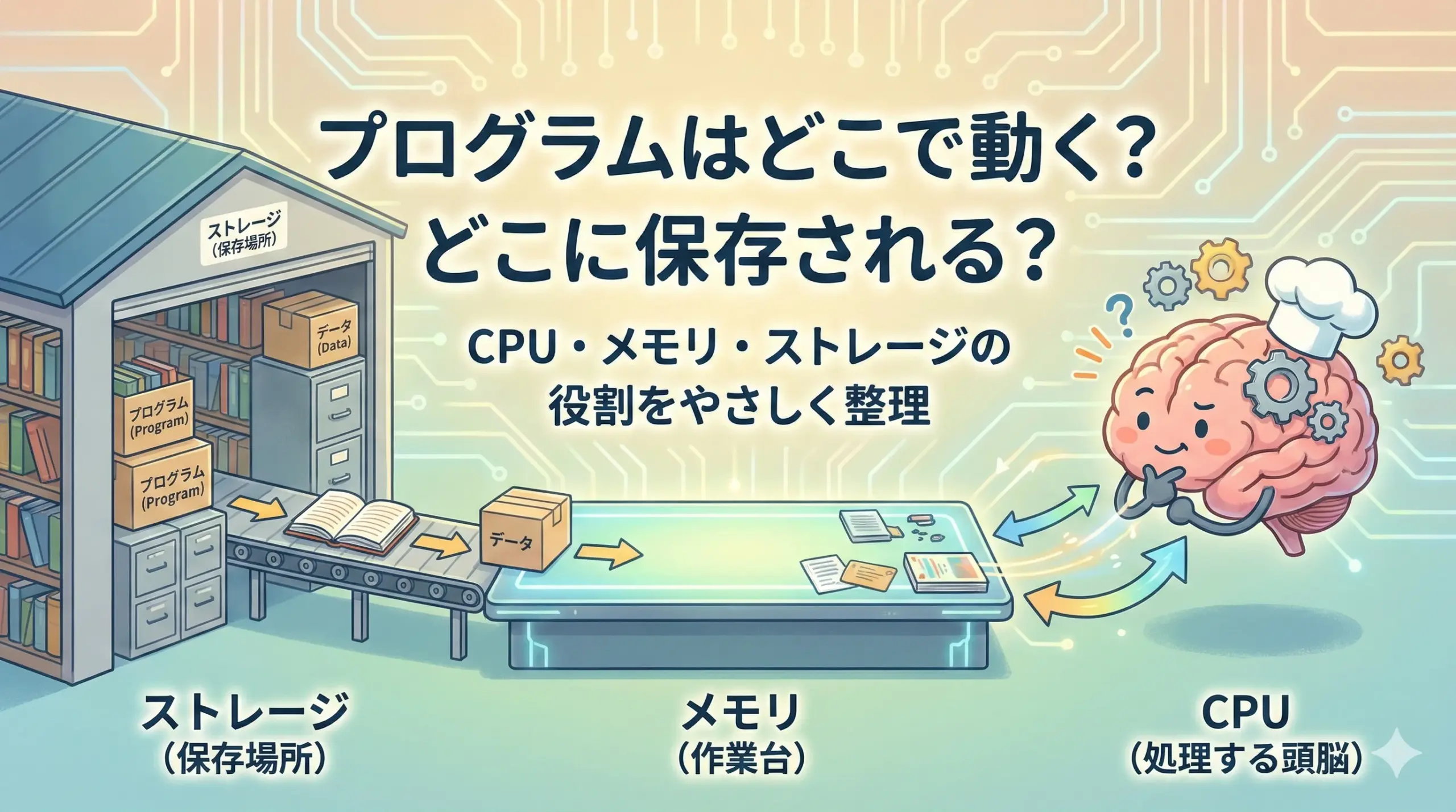 本記事では、CPU・メモリ・ストレージの役割と、プログラムが「どこで動いて」「どこに保存されている」のかを、プログラミング初心者の方向けに整理して解説します。