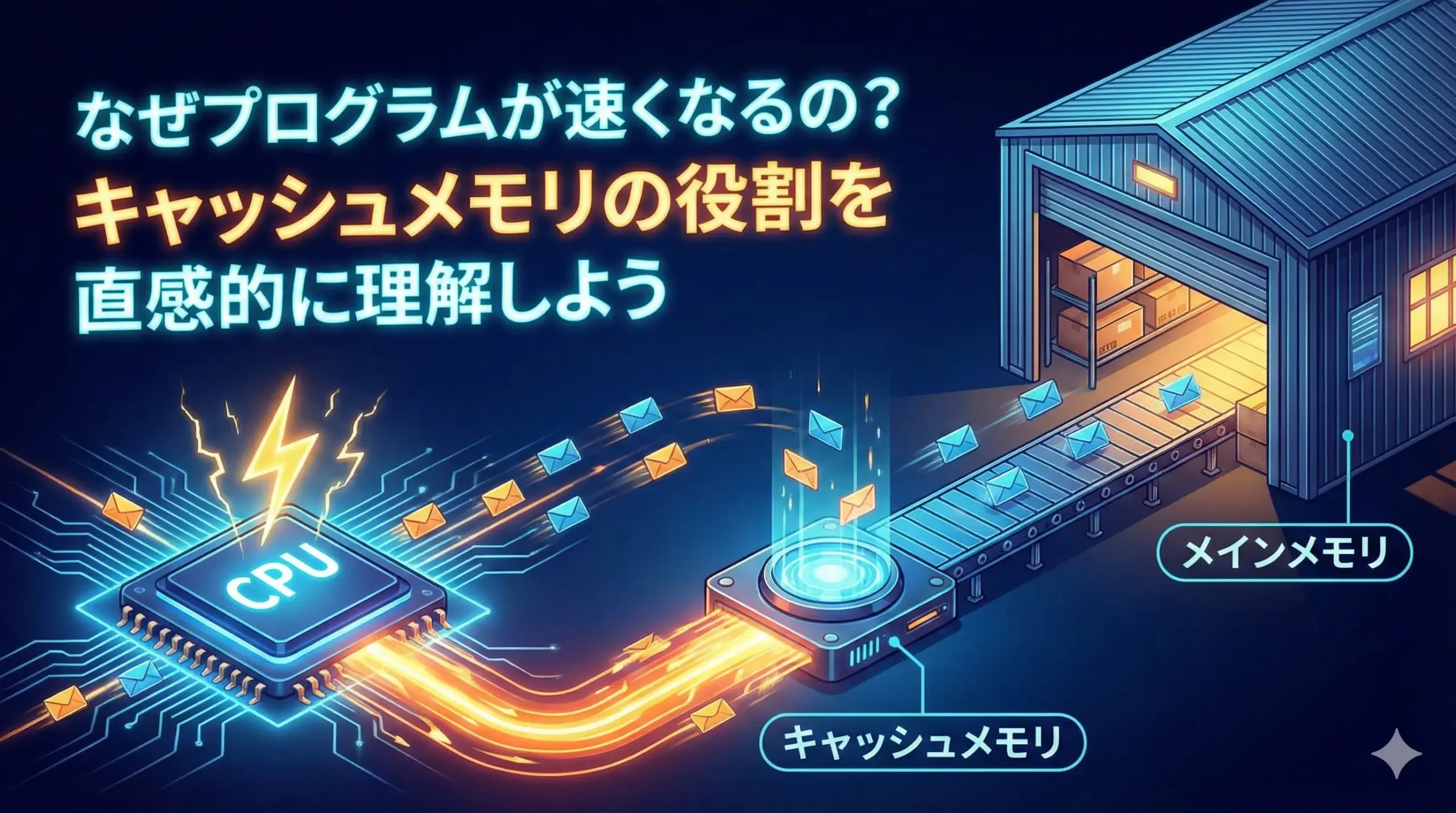 キャッシュメモリは、CPUとメインメモリの間で「よく使うデータを手元に置く」ことで待ち時間を減らし、プログラムを速くする仕組みです。