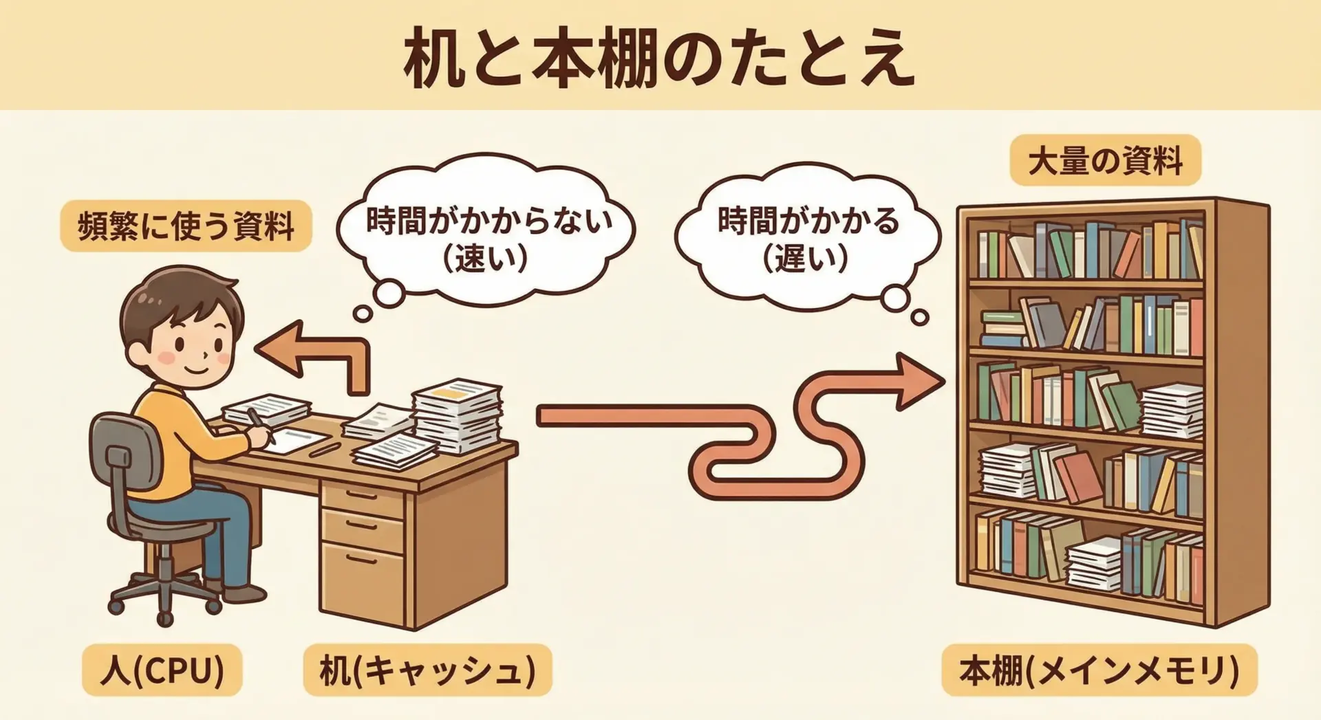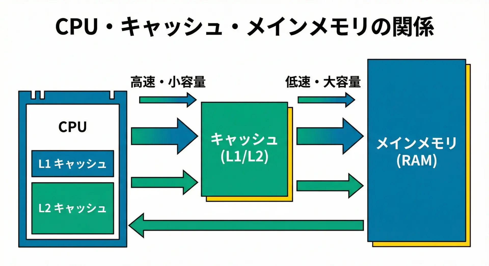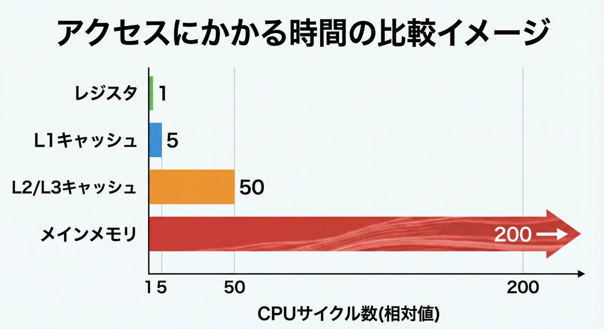 CPUは非常に高速ですが、メインメモリ(RAM)からデータを取ってくるのは相対的に時間がかかります。