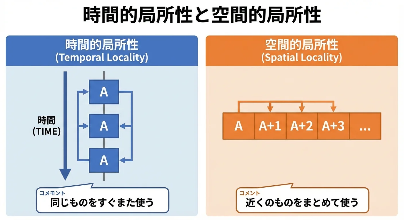 多くの処理には時間の近さ(最近使ったものをまたすぐ使う)と場所の近さ(近くに並んだデータを続けて使う)が見られます。