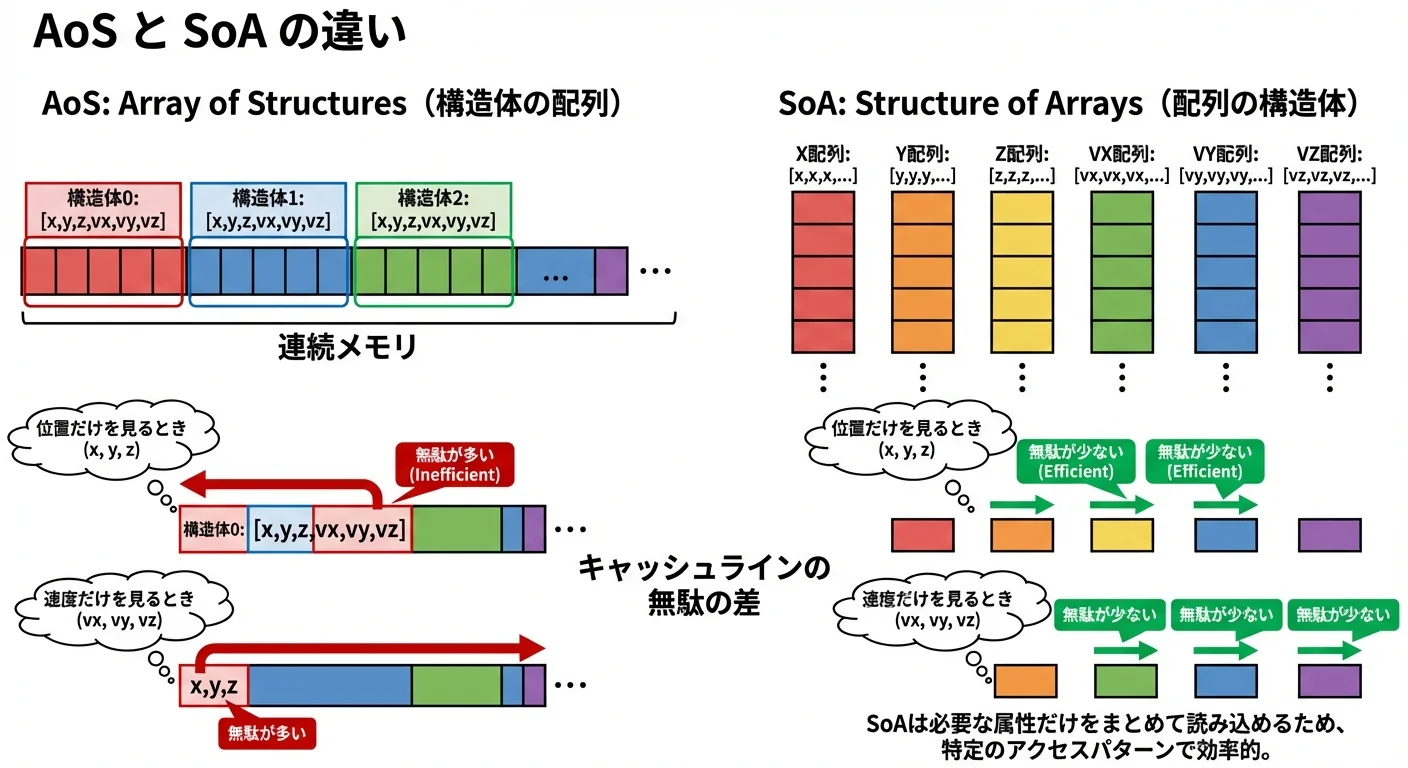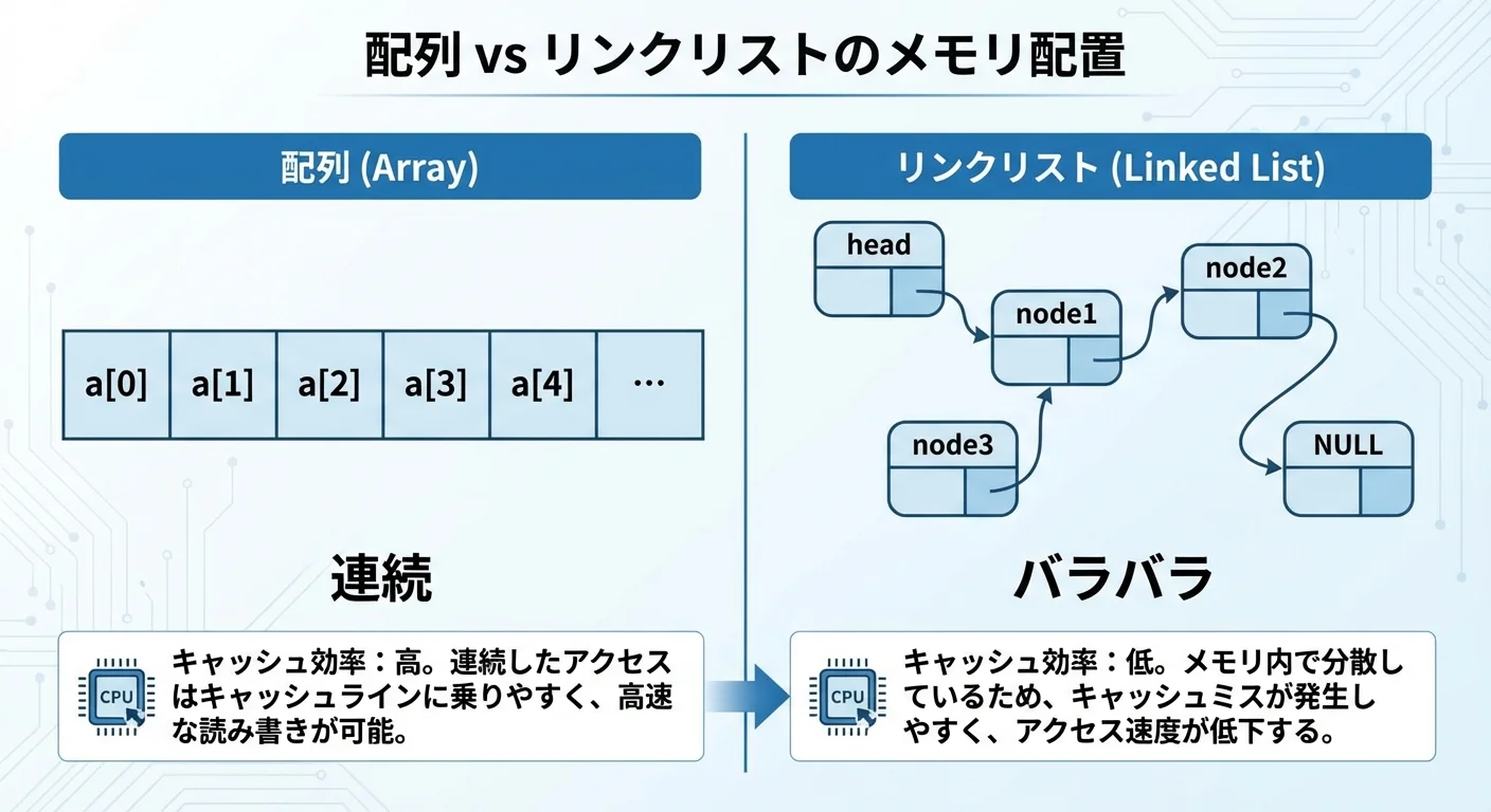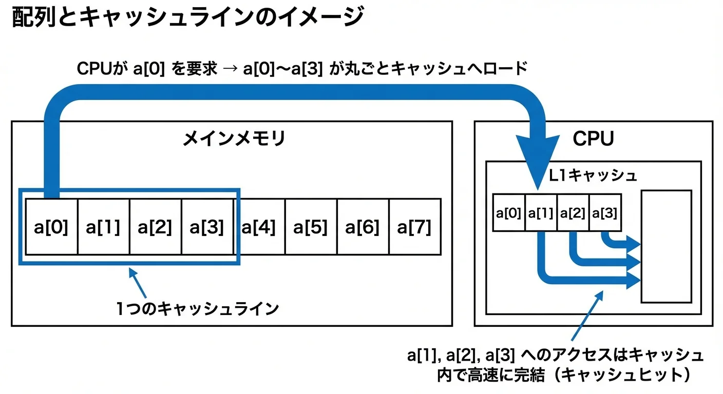 1つの要素を読むと、その近くの要素も一緒にキャッシュに入るため、隣り合うデータを順番に使うと特に速くなります。