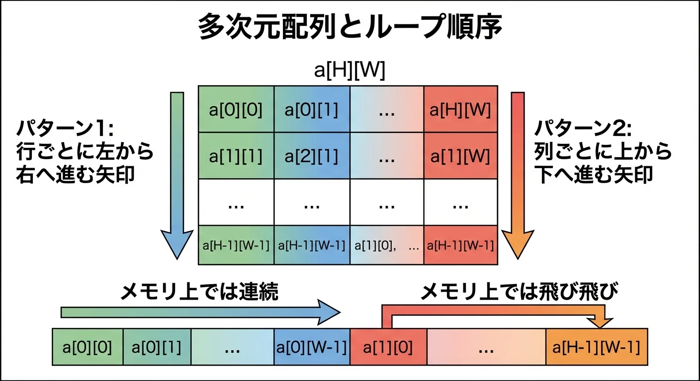 2次元配列では、メモリ上の並び方に合わせて内側ループを決めると効果的です。