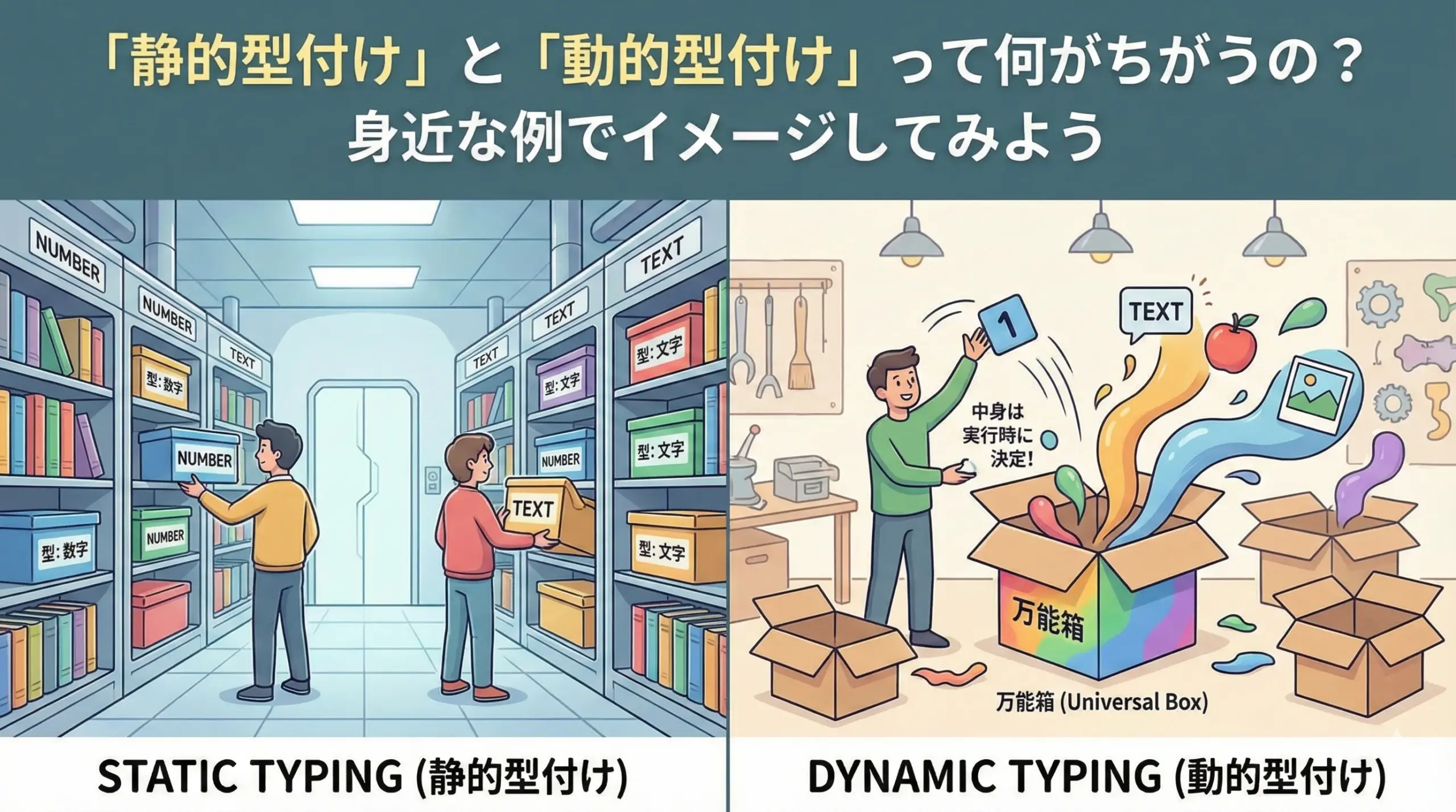この記事では、静的型付けと動的型付けの違いを、荷物ラベルやなんでも入る箱といった身近な例からたどりながら、特徴やメリット・デメリット、向き不向きについて整理しました。
