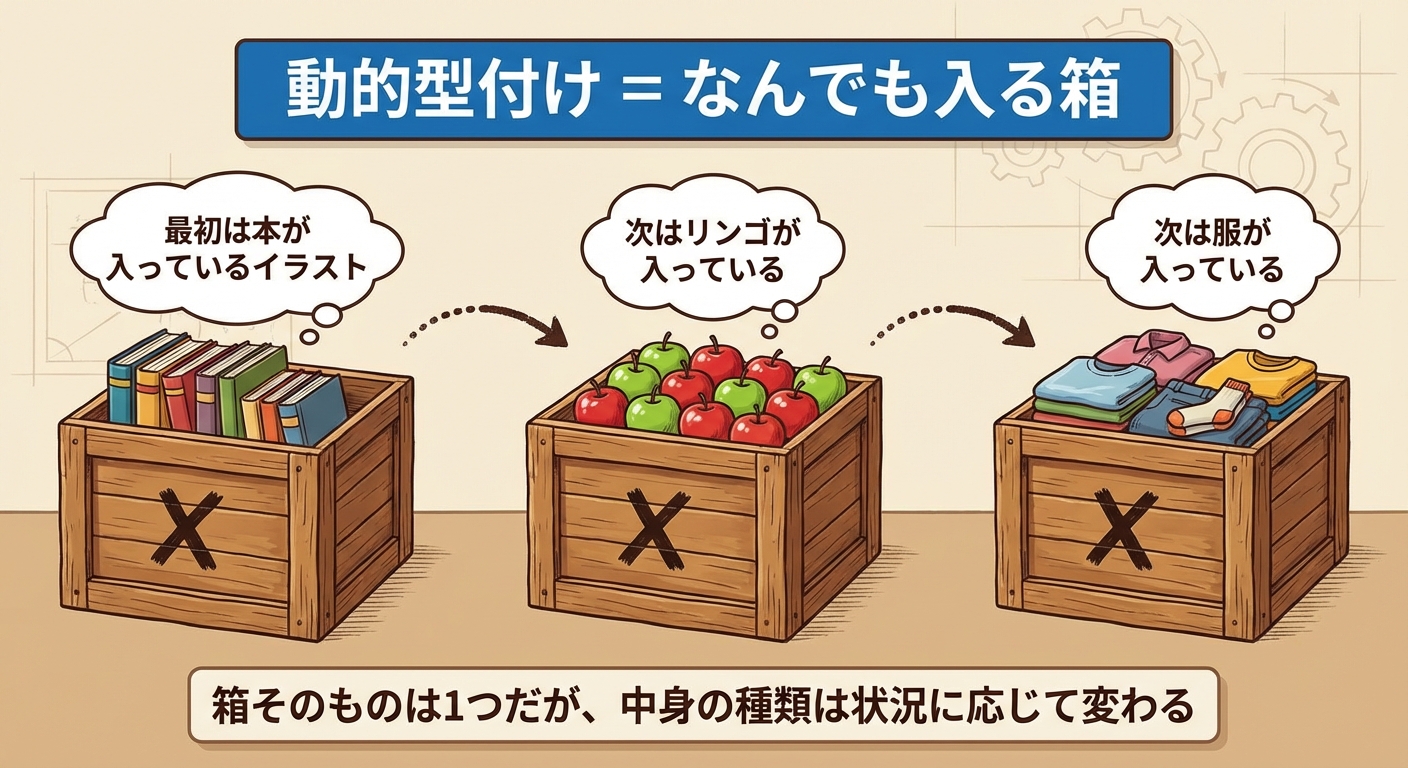 「箱にラベルを貼ってから使う」「合わないものを入れようとしたら事前に止める」というところが、静的型付けの本質的なイメージです。