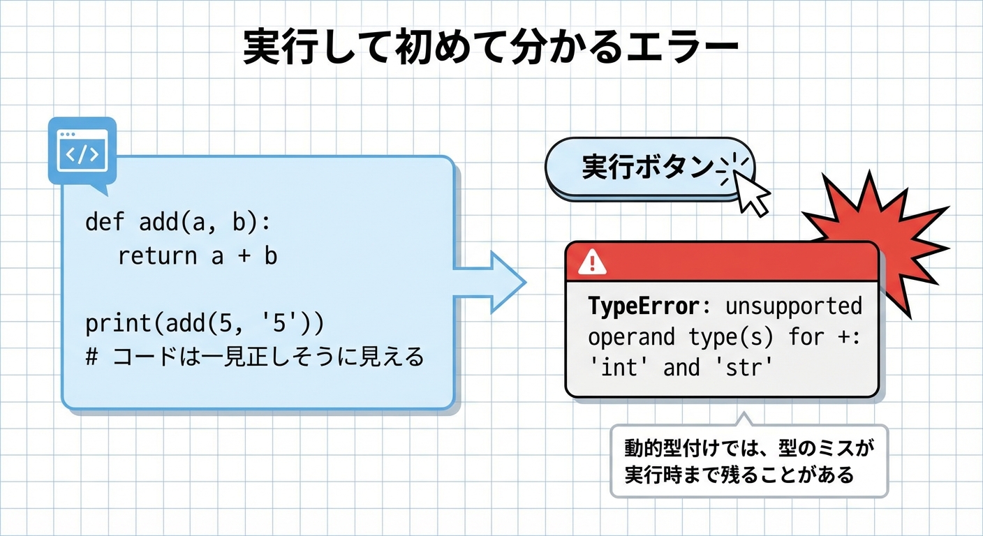 動的型付けの注意点は、「実行するまで気付かないエラー」が増えやすいところです。
