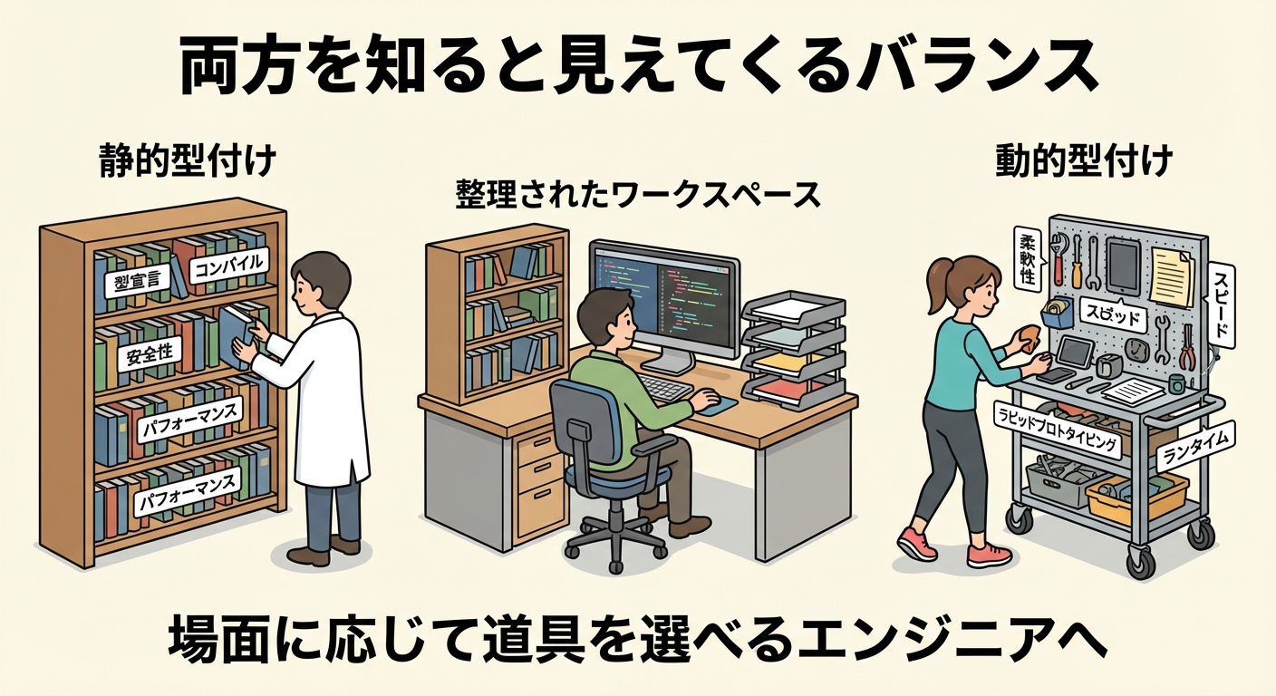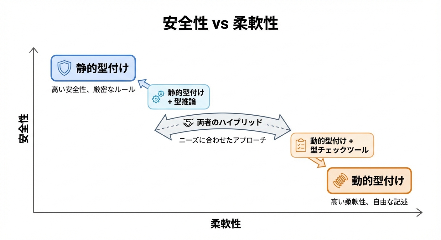 実際の現場では、「動的型付け + ツールで静的チェック」のようなハイブリッド構成も一般的です。