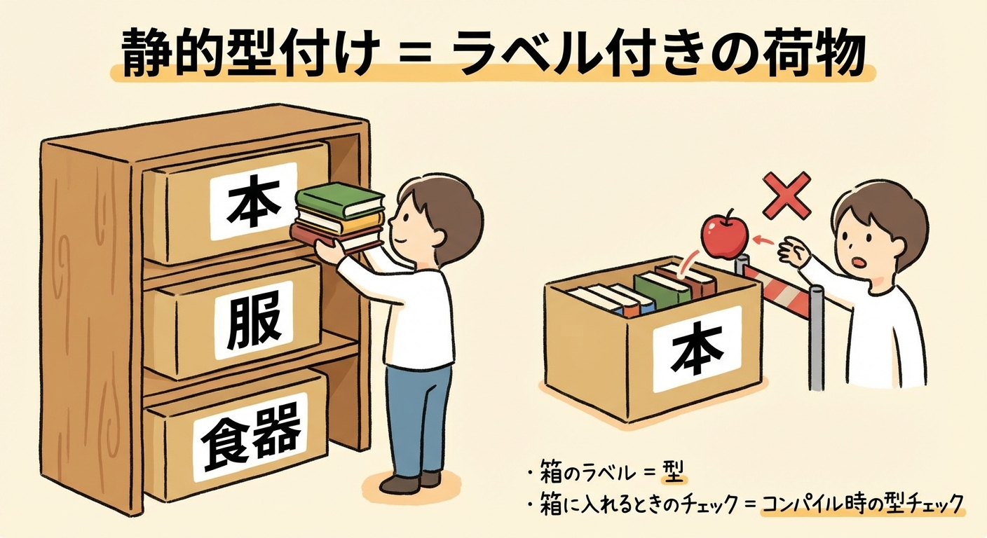 静的型付けは、よく「荷物にしっかりラベルを貼る」ことにたとえられます。