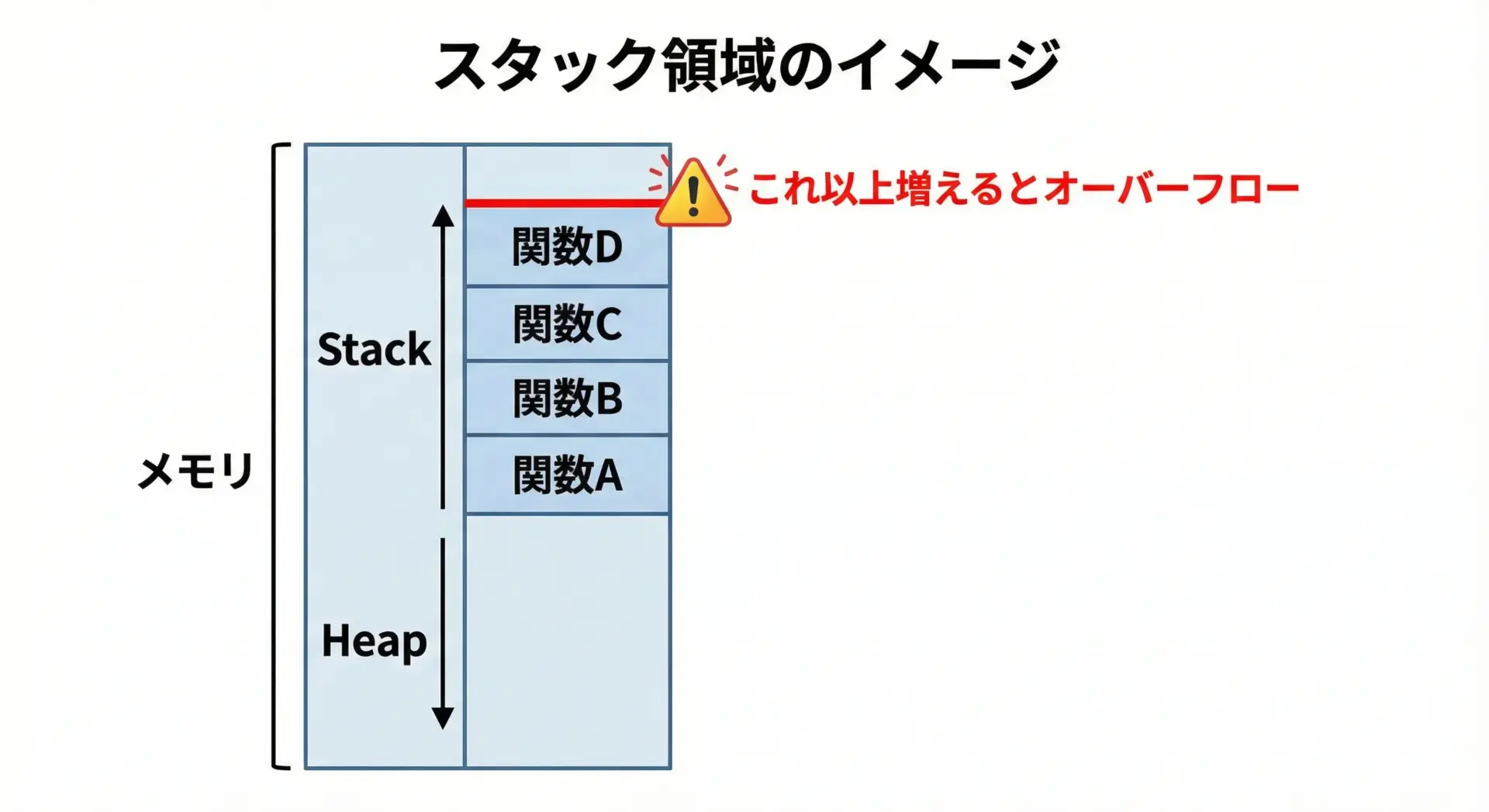 スタックオーバーフローとは、プログラムが使ってよいスタック領域を使い切ってしまい、これ以上データを積めなくなった状態を指します。