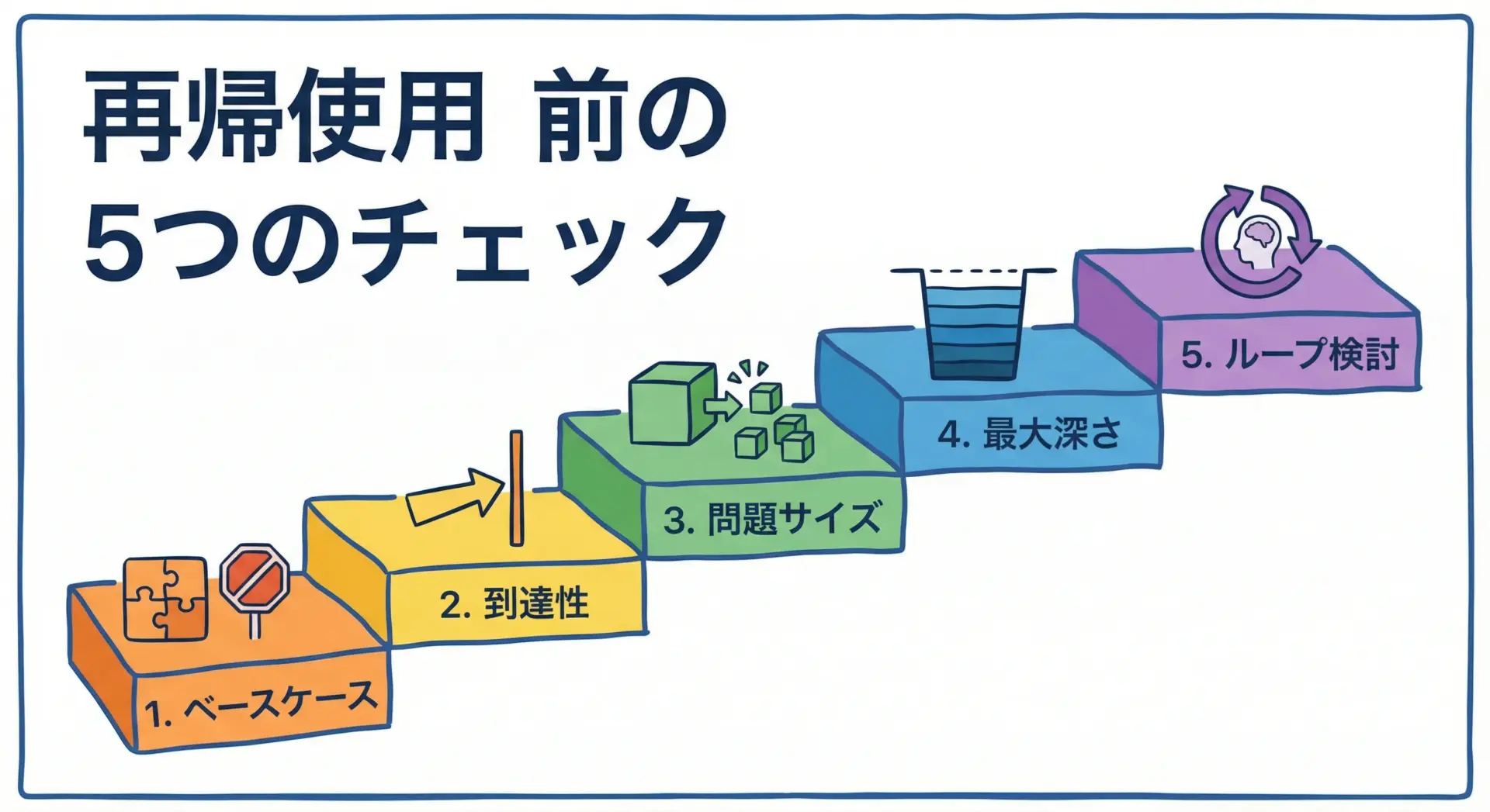 ベースケースを丁寧に設計し、引数の変化と最大深さを意識し、必要に応じてループやテイル再帰最適化を活用することが、安定したコードへの近道です。
