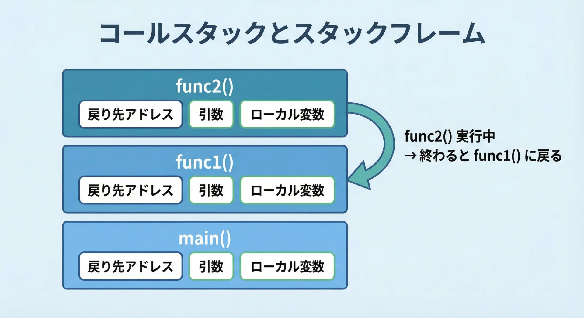 ここでいうスタックは、データ構造としてのスタック(LIFO: Last In, First Out)とほぼ同じ考え方で、関数呼び出しの情報を一時的に保存しておくメモリ領域です。