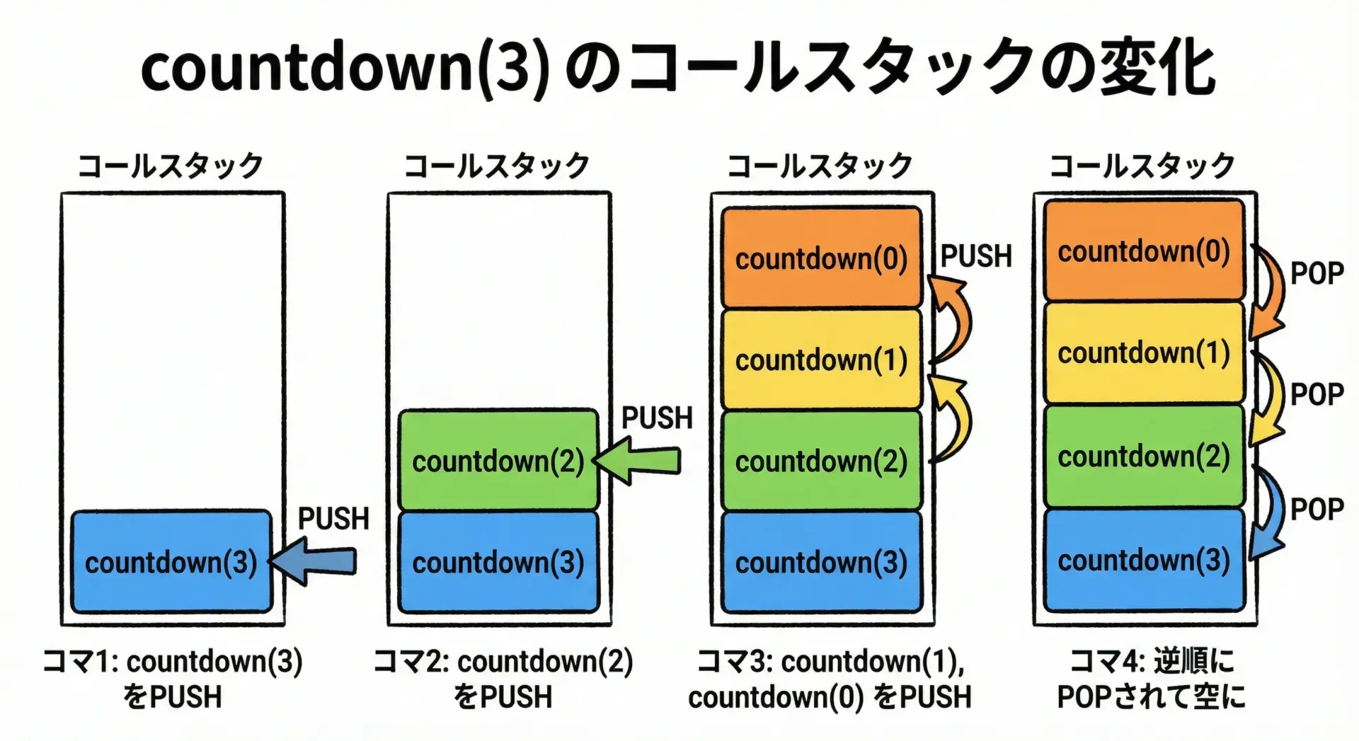 countdown(3)を呼ぶ3 != 0なのでcountdown(2)を呼ぶ(新しいスタックフレームが積まれる)2 != 0なのでcountdown(1)を呼ぶ1 != 0なのでcountdown(0)を呼ぶ0 == 0なので「end」を表示してreturnし、1つ上のcountdown(1)に戻るcountdown(1)が終了し、さらにcountdown(2)に戻る- 最後に