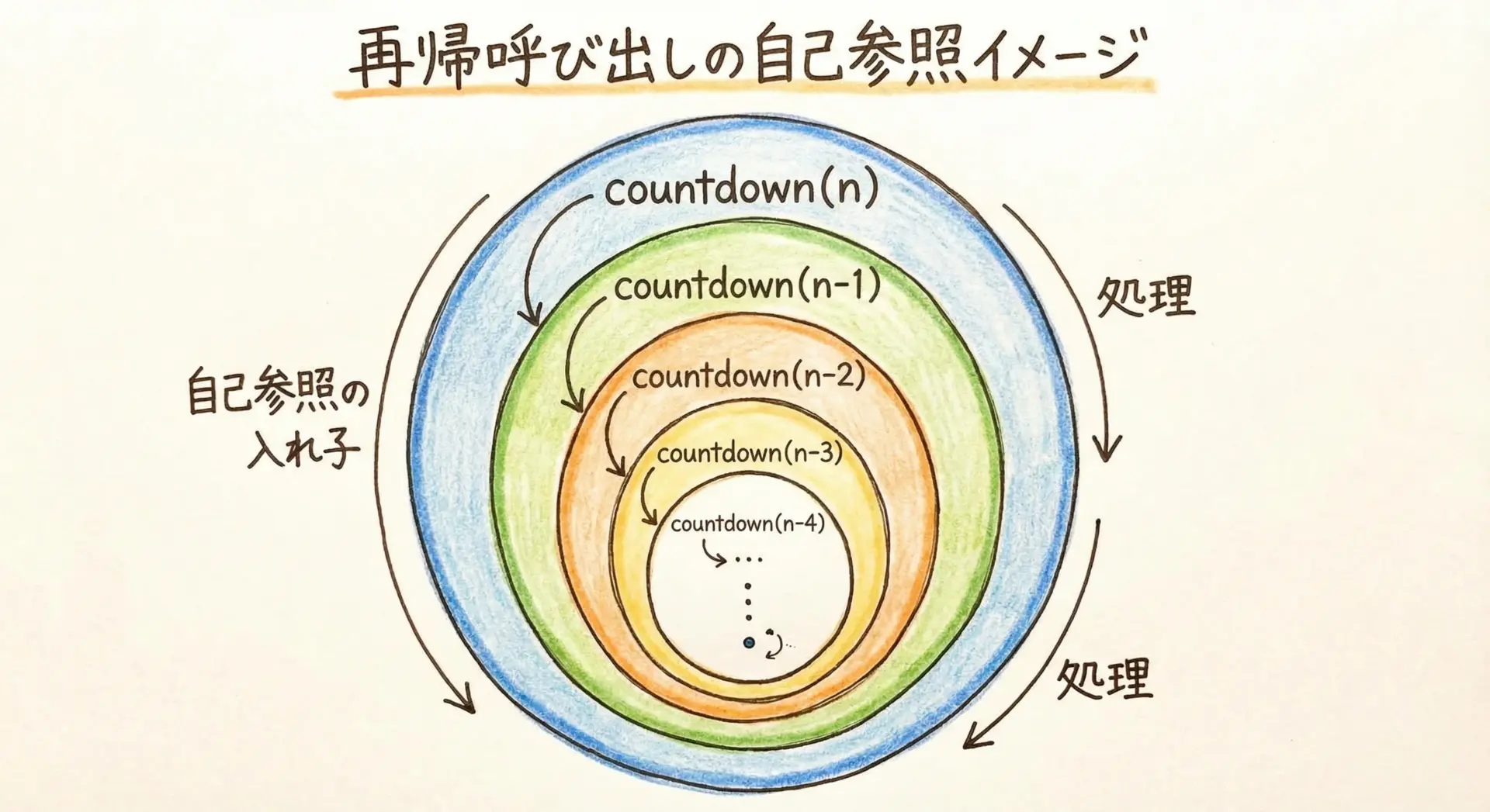 このcountdown関数は、自分の中でcountdownを呼び出しているので、再帰関数です。