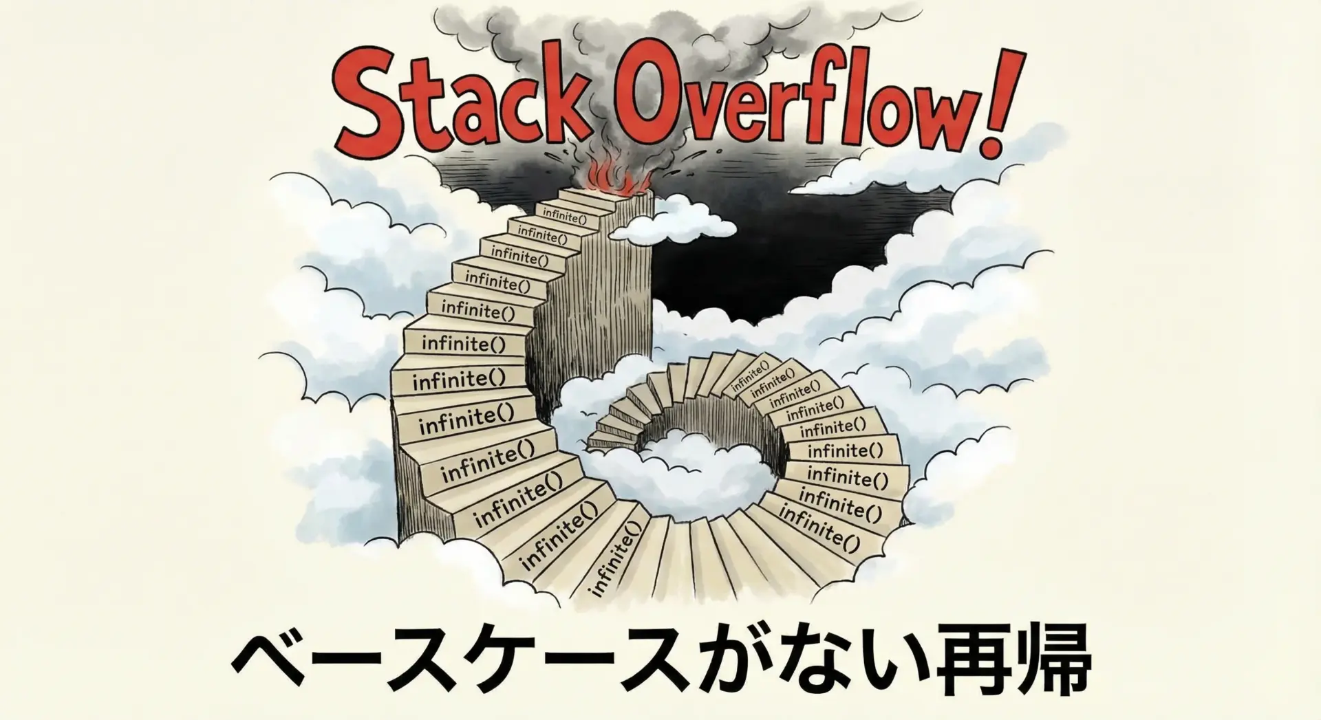 ベースケースを忘れた再帰は、スタックオーバーフローの典型です。
