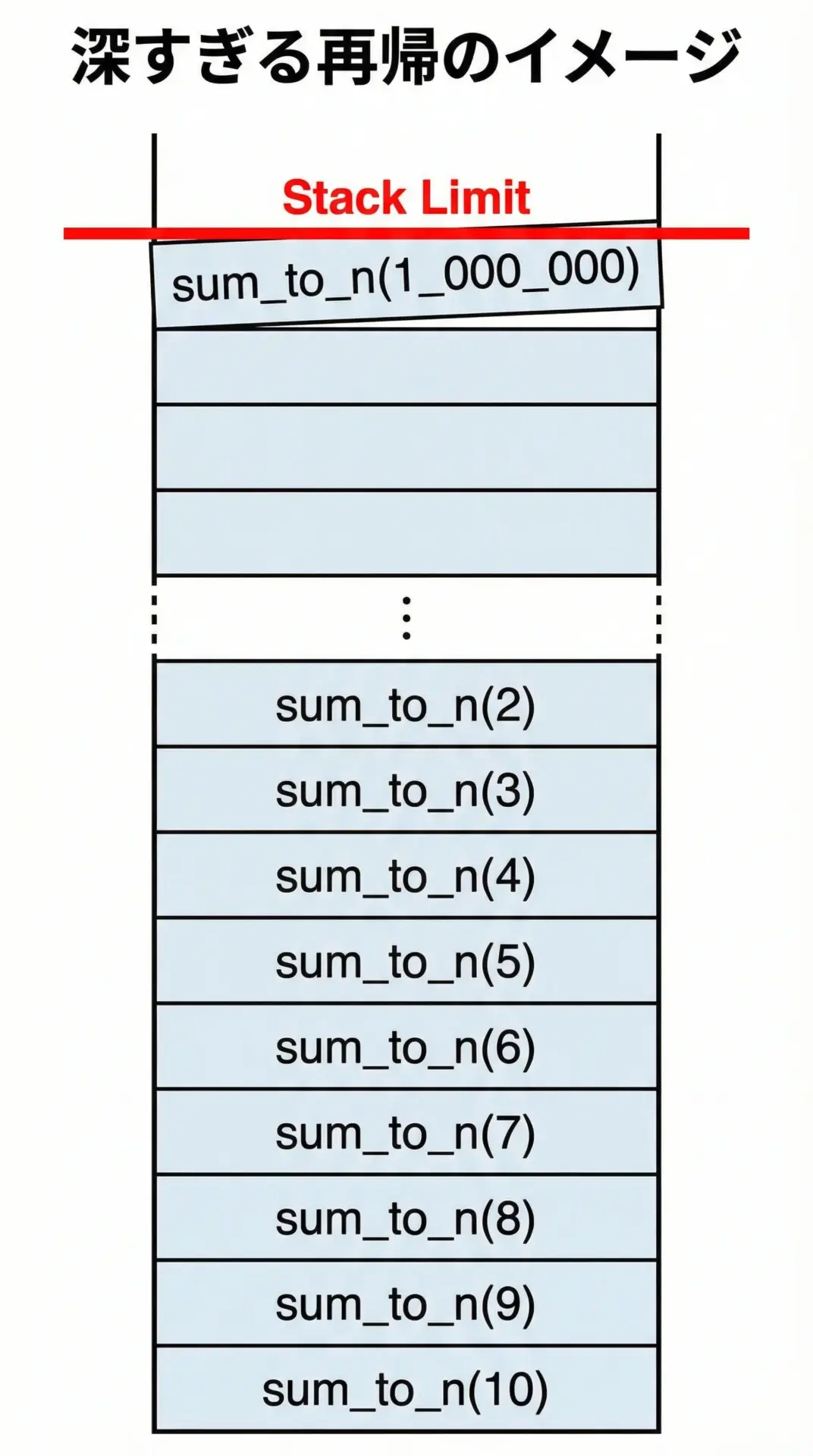- デメリット: 呼び出しごとにスタックフレームを消費し、スタックオーバーフローのリスクがある