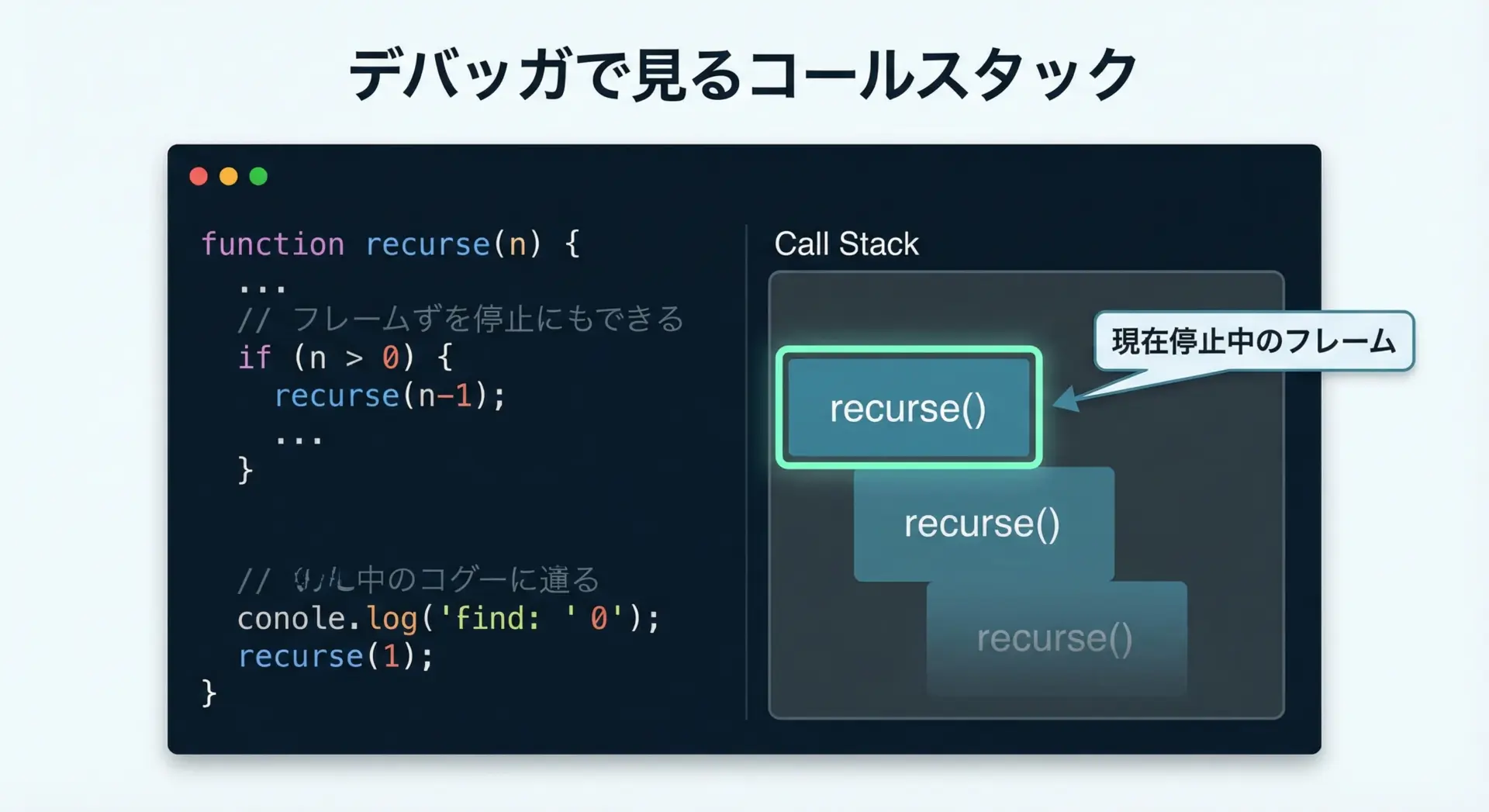 スタックフレームやコールスタックのイメージを理解すると、「なぜ再帰で落ちやすいのか」「どこを直せばよいのか」が見えやすくなります。