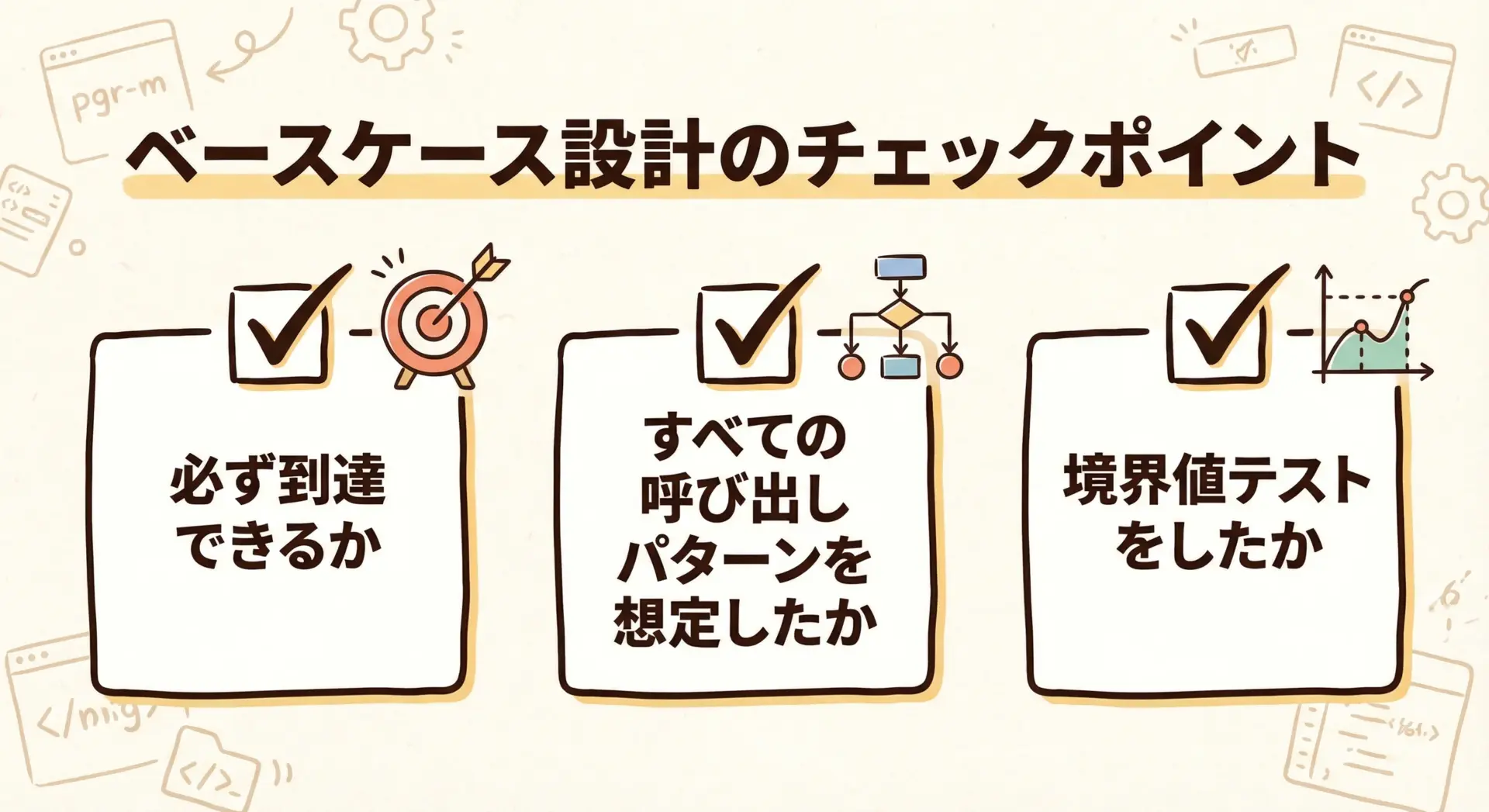 安全なベースケースを考えるときには、次の3点を意識するとよいでしょう。