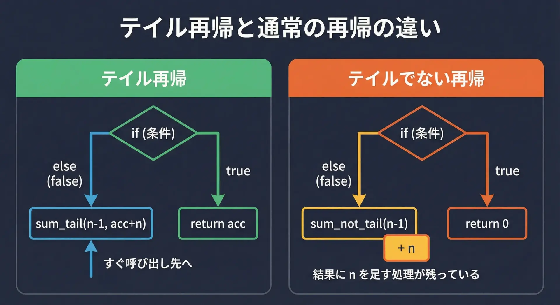 たとえば、Javaや標準的なPythonはテイル再帰最適化を行いません。関数型言語や一部のコンパイラでのみサポートされます。 - テイル位置でない再帰には効かない