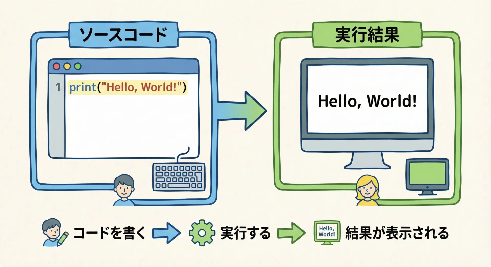「Hello, World!」は、画面に挨拶を表示するだけの短いメッセージです。